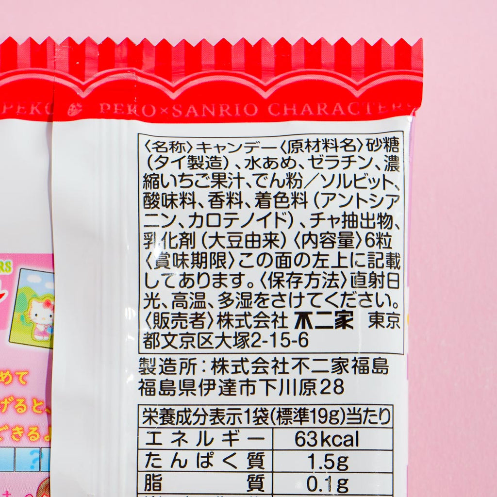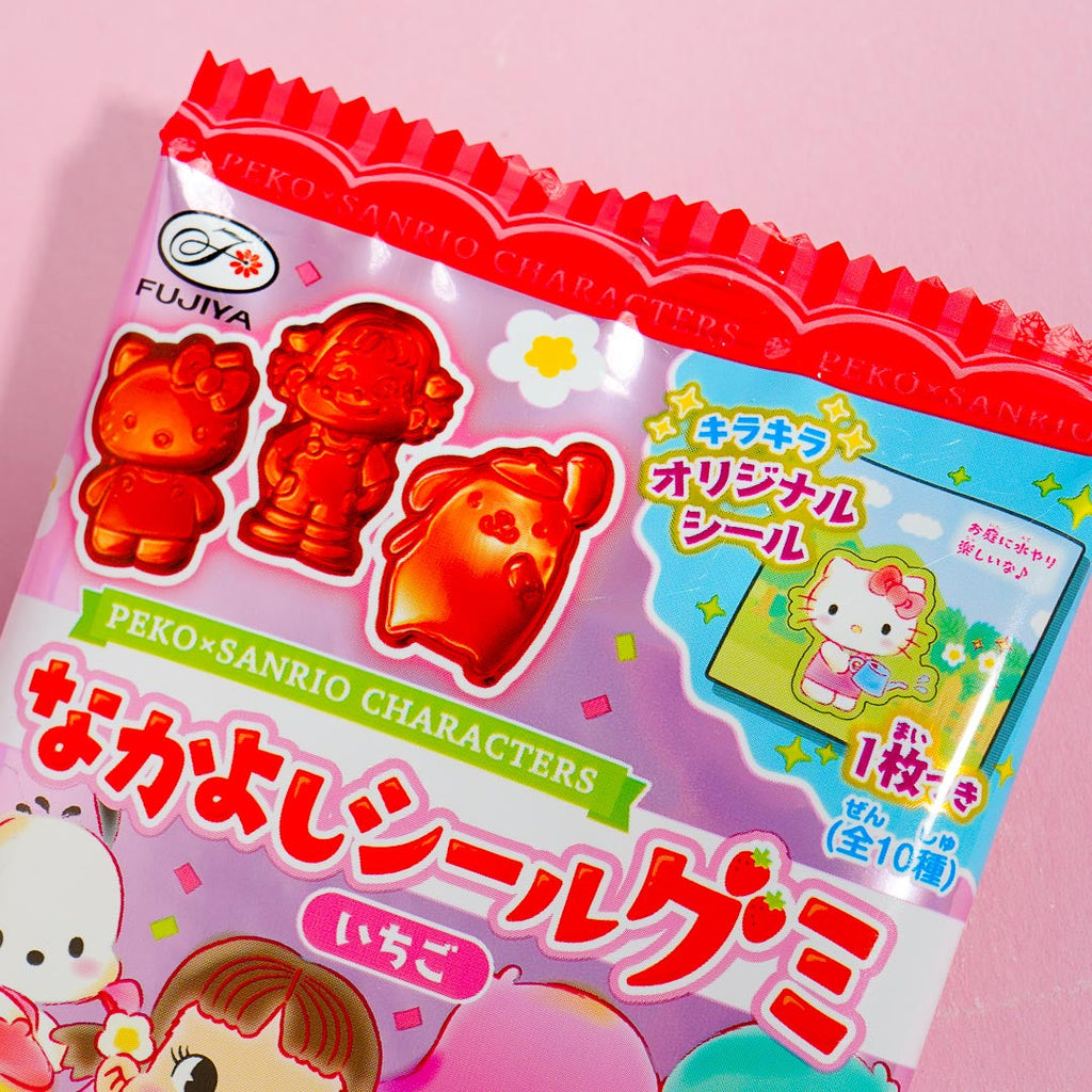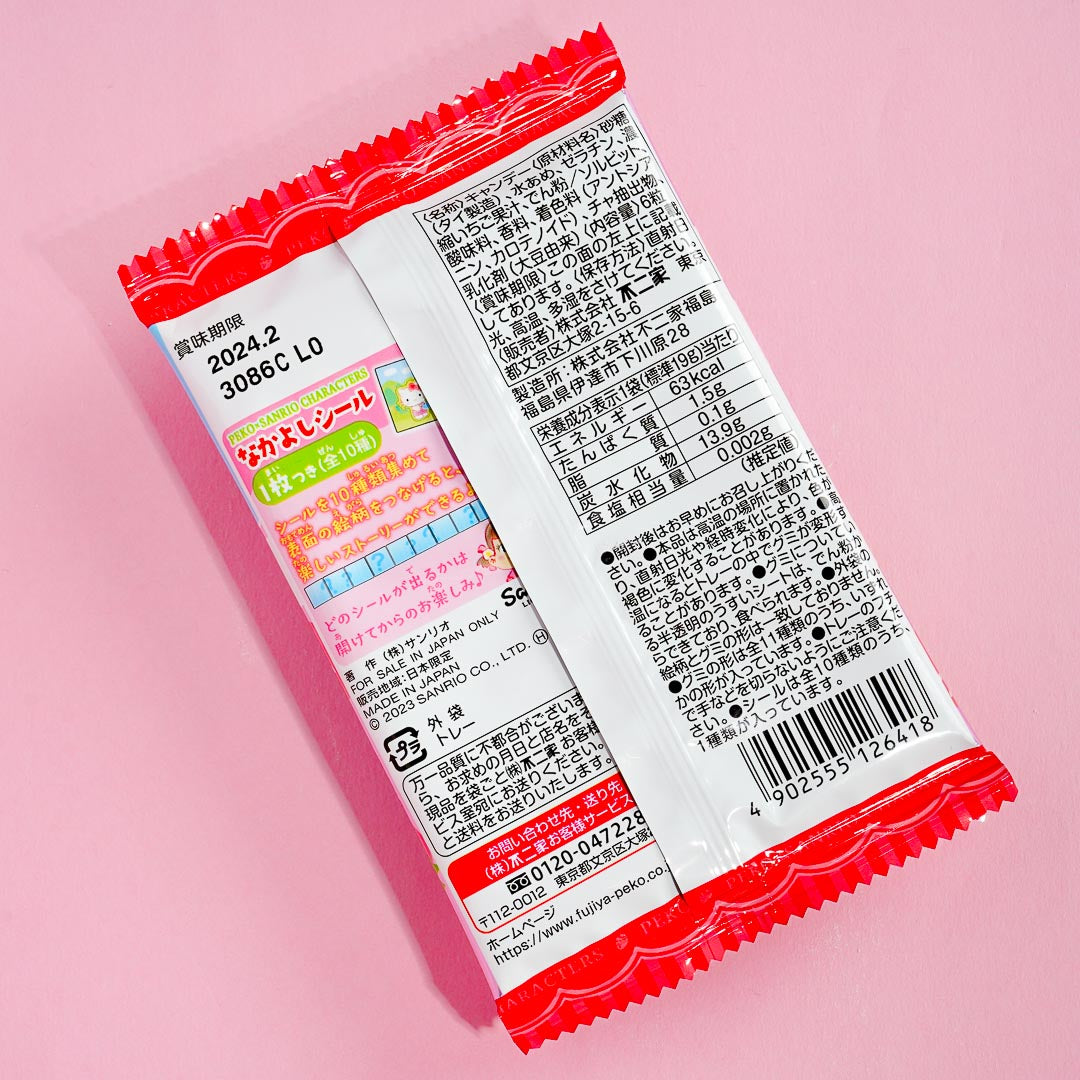 This pack of strawberry-flavored gummies comes from a collaboration between Fujiya and Sanrio! It showcases prints of Peko-chan and Sanrio cuties like Hello Kitty hanging out together. Enjoy nibbling on these strawberry treats shaped like your favorite kawaii character!