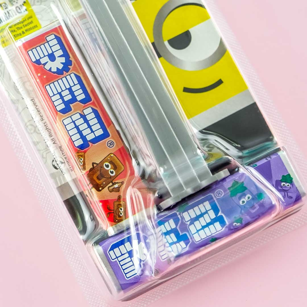 A pack of grape and cola-flavored candy with a PEZ dispenser featuring Bob from Despicable Me