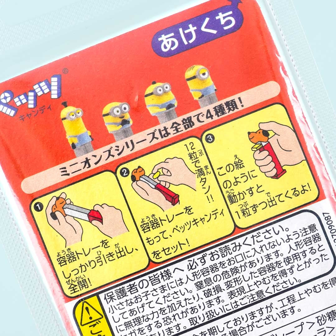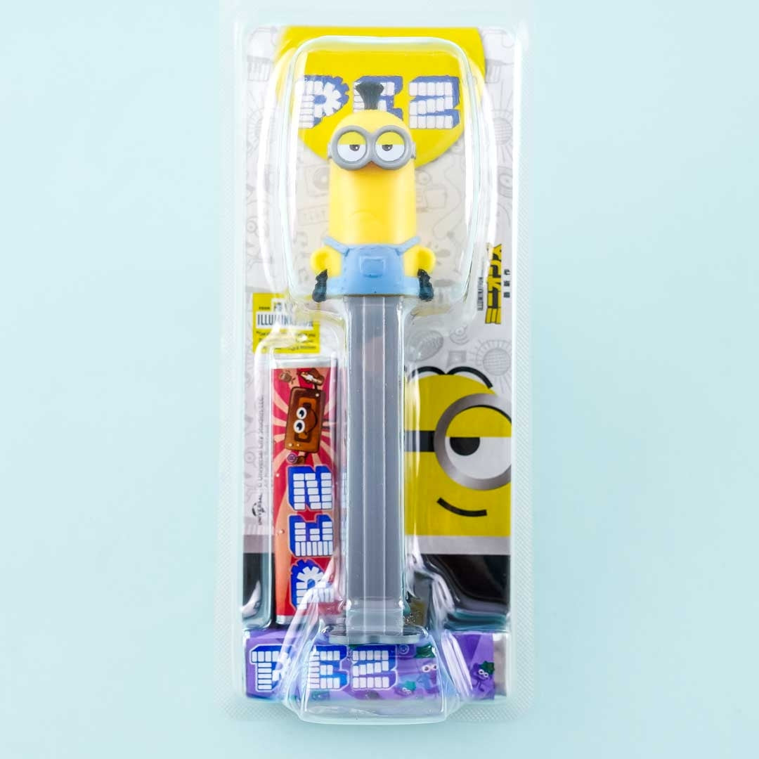A pack of grape and cola-flavored candy with a PEZ dispenser featuring the minion Kevin from Despicable Me