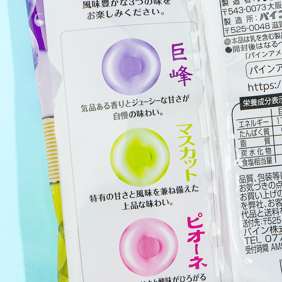 Share this pack of delicious grape-flavored sweets with your best friends! The bag contains different flavors from three grape varieties: Kyoho grapes, Muscat grapes, and Pione grapes.