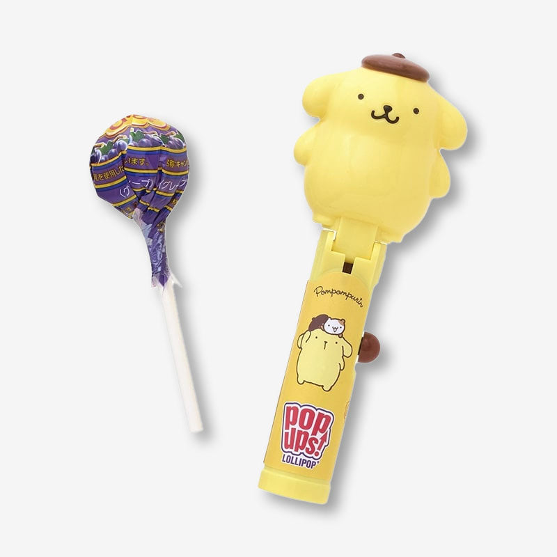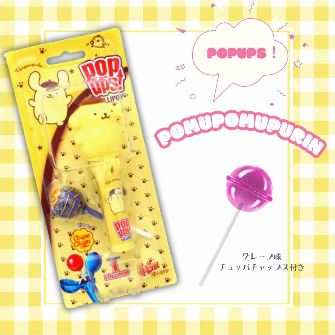 Keep your lollipop safe and tasty with this cute Pompompurin lollipop holder! The reusable case lets you enjoy your candy anytime while keeping it fresh and ready for your next bite. This set comes with a grape-flavored Chupa Chups.