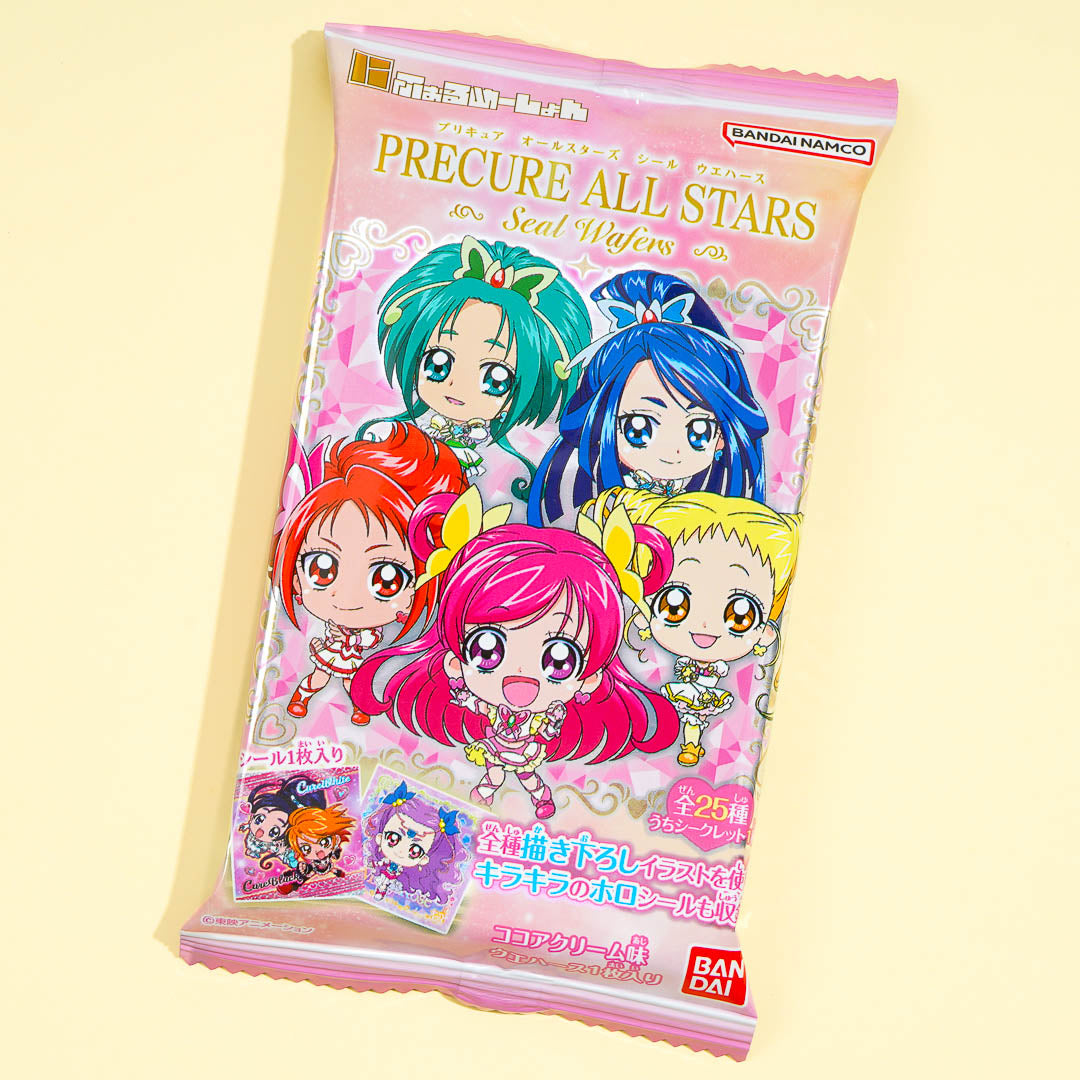 Add this cocoa cream wafer pack to your secret stash of anime snacks! It features prints of the chibi or small versions of characters from Pretty Cure All Stars. This cocoa cream wafer also comes with a collectible sticker. Surprise yourself with a random design from a set of 25 different stickers!