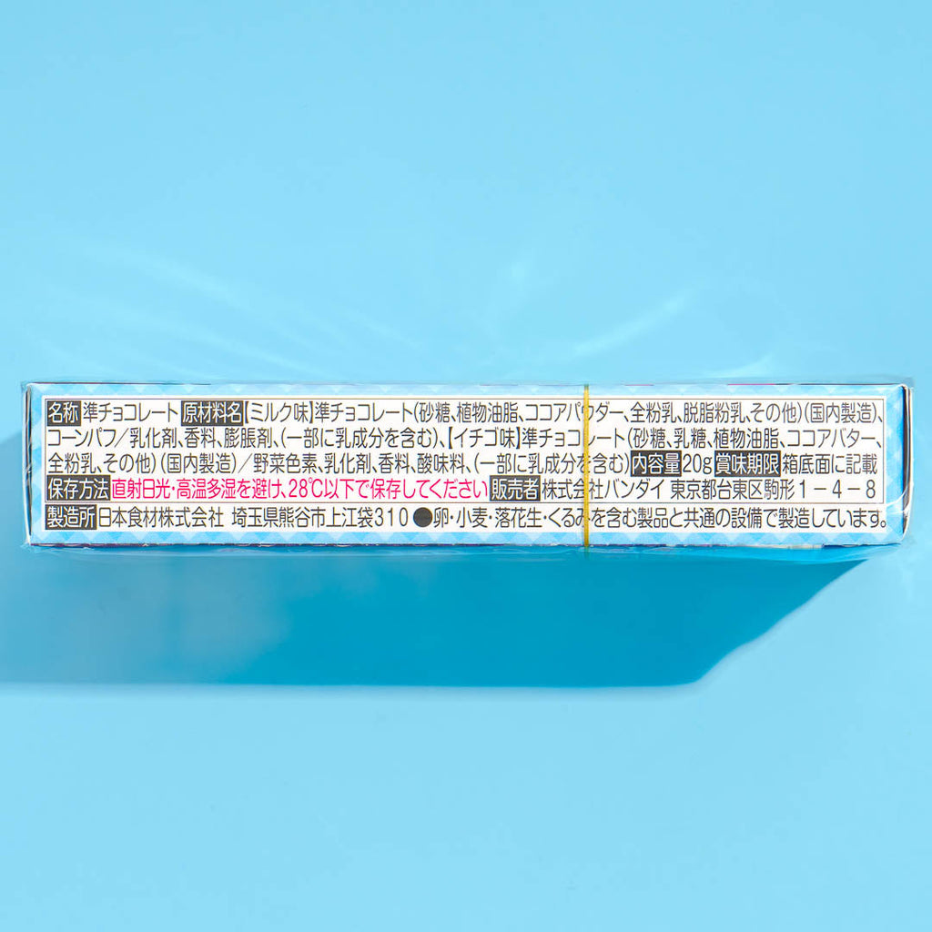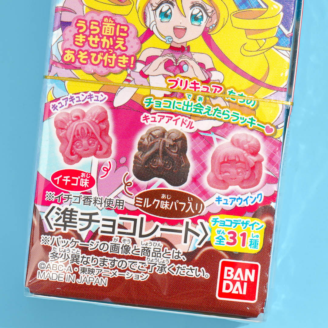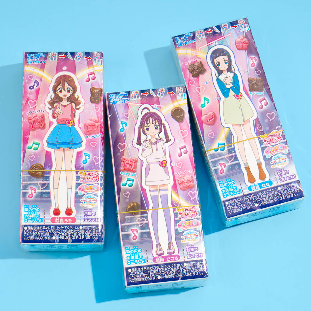 Give in to your sweet tooth with this box of chocolates illustrated with Pretty Cure characters. These chocolates are shaped like the faces of Pretty Cure girls and other cute things. Enjoy two different chocolate flavors - strawberry and milk chocolate. At the back of the box, you'll get a random Pretty Cure dress-up doll that you can cut out and play with.