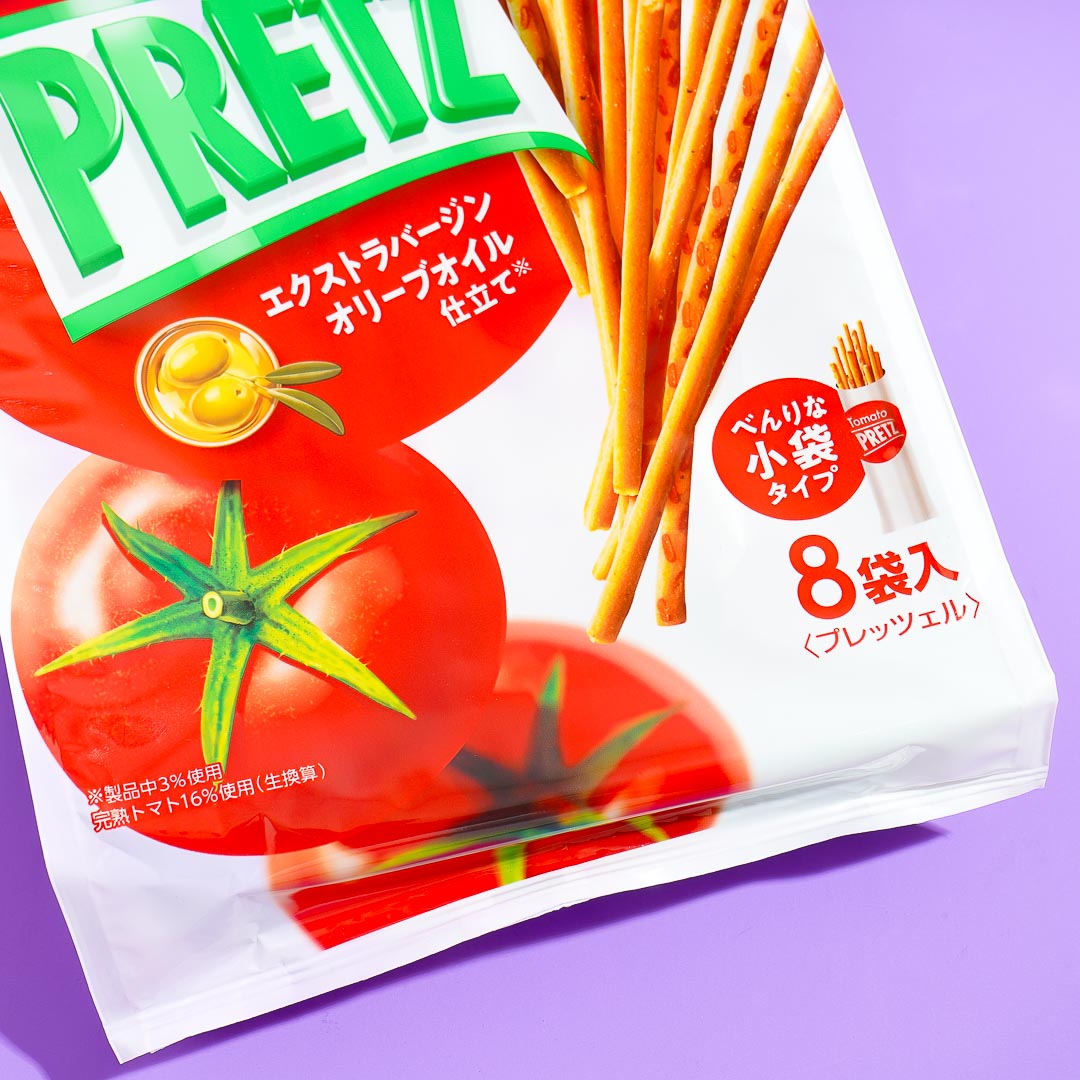 Pretz is a delicious, funny biscuit snack from Japan, made by the famous Glico! Not only are Pretz sticks covered in a diverse assortment of flavor, but they also come in a broad array of styles and shapes. These sticks are flavored with a tasty flavor of tomato salad! Enough to share with friends and family, and excellent snack set to parties! Made in Japan!