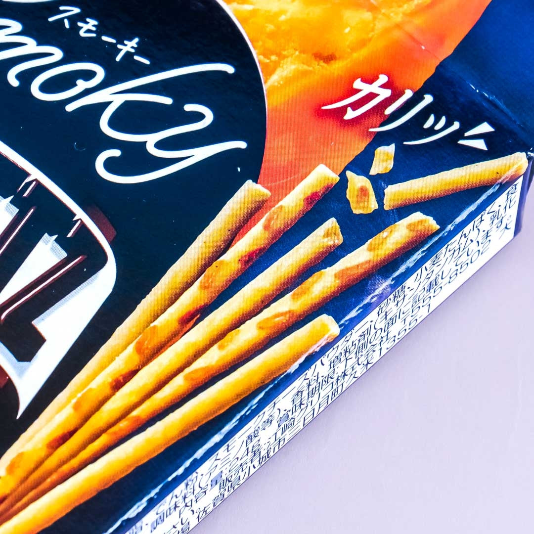 Taste the premium flavor of smoked cheese in this box of biscuit sticks! These snacks are thinner and crispier than the usual Glico Pretz.