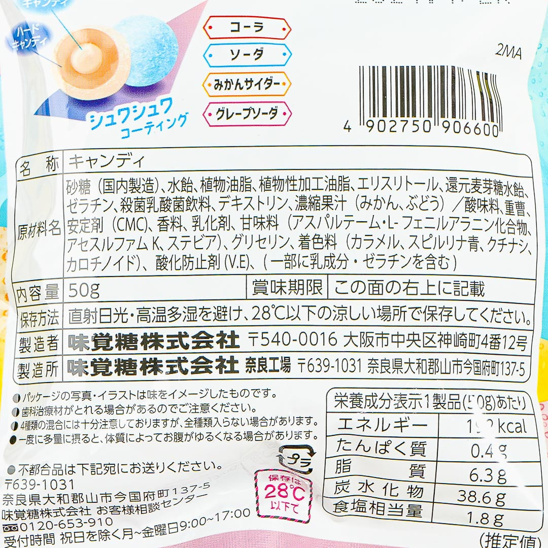 • A pack of round hard and chewy candies in cola, soda, melon soda, and peach soda flavors