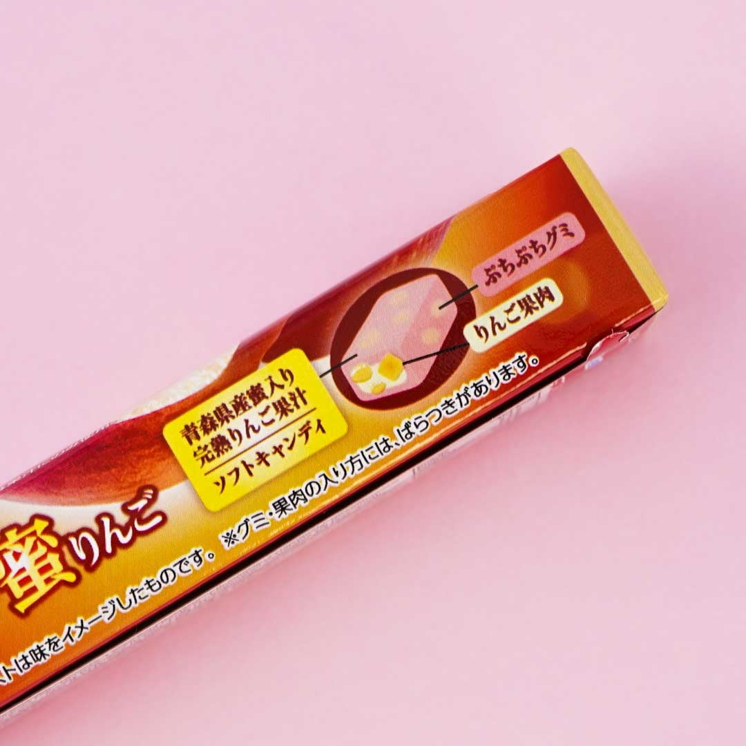Savor the taste of Mitsu apples or honey-filled apples from Aomori Prefecture in Japan! Each individually wrapped chewy piece also contains both puchi puchi gummy bits and dried apple pulp.