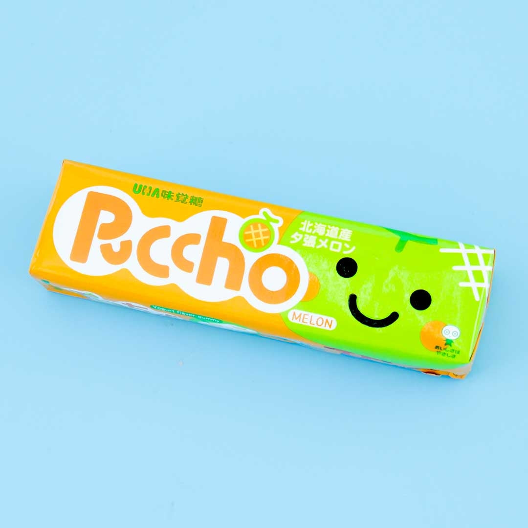 Puccho melon flavored fruit and yoghurt candies include delicious gummy pieces and real fruit juice. The secret to success of Puccho is that each soft and milky candy piece is embedded with chewy fruit gummy bits. You can enjoy milky and chewy candy and less chewy fruity bits simultaneously. Like eating rainbows! The brightly colored packaging is also extremely kawaii and and Puccho candies come in several different flavors. Try them all!