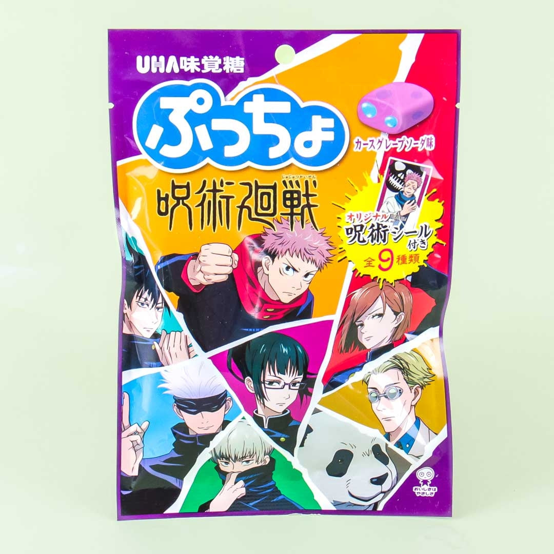 This pack of grape soda-flavored chewy candy features characters from the fantasy anime Jujutsu Kaisen! It comes with a Jujutsu Kaisen sticker randomly chosen from a set with 9 different designs.