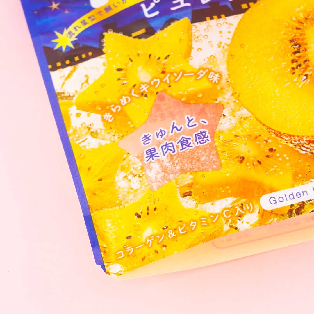 • A resealable pack of gummy candies that mixes the taste of golden kiwi and soda