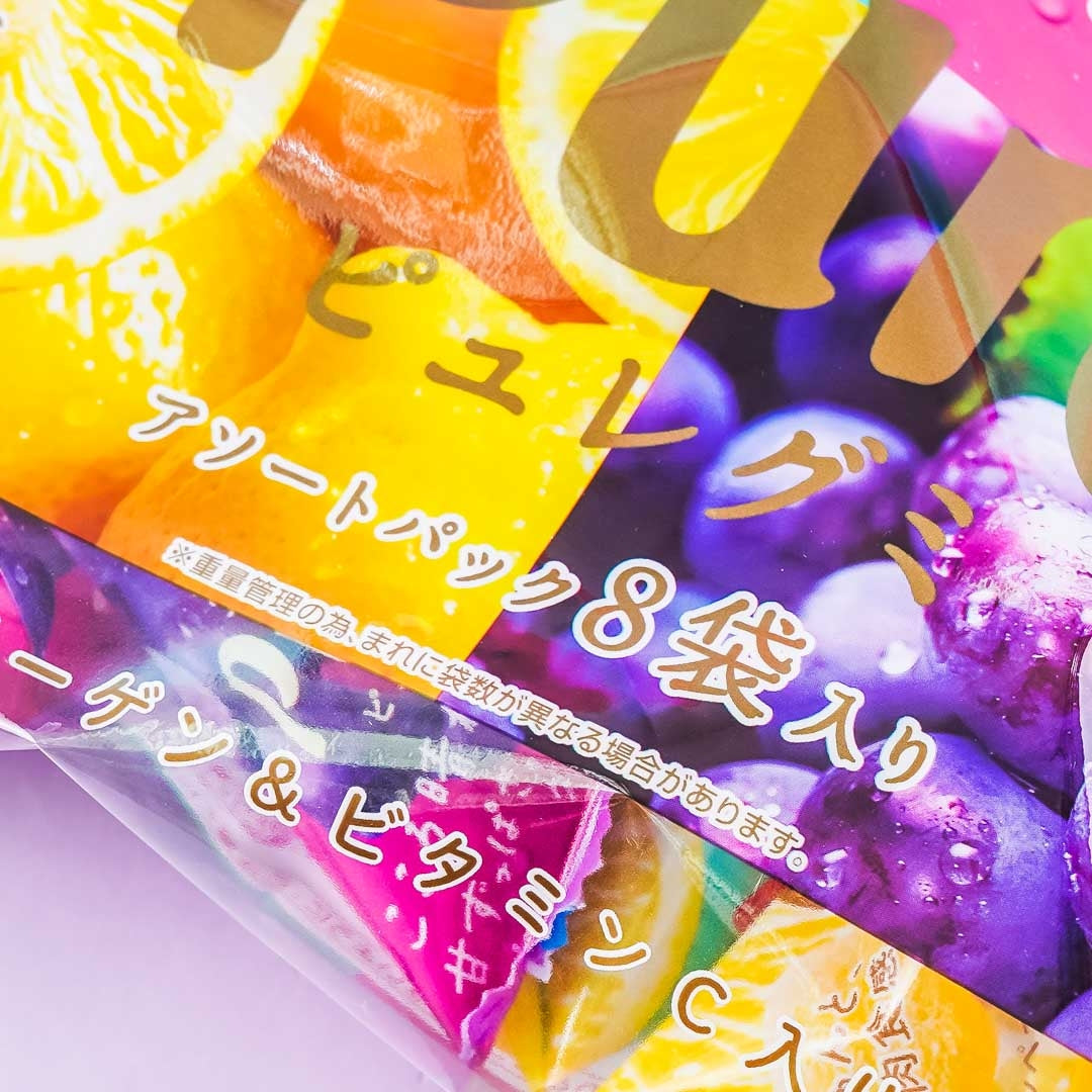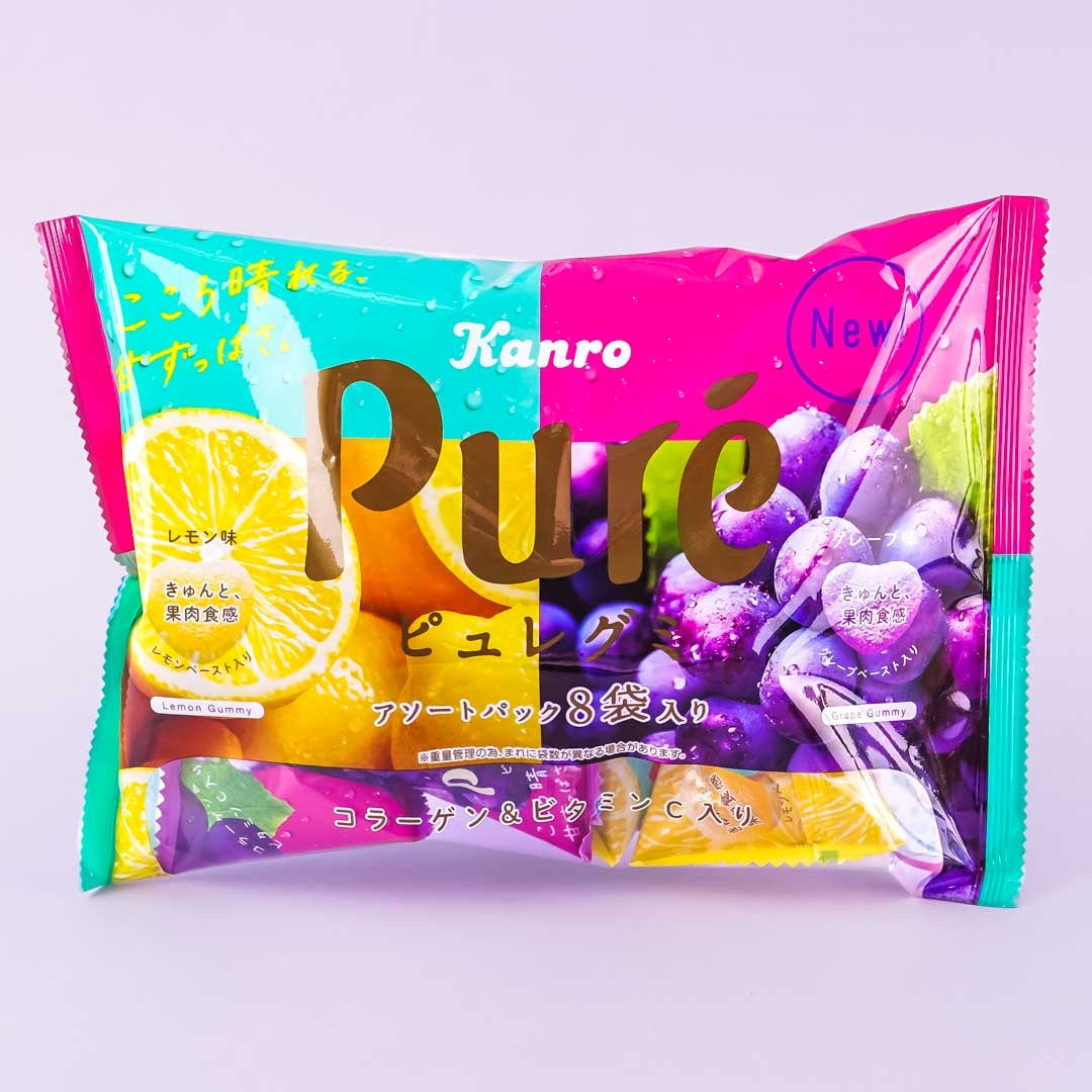 Enjoy two of the most popular Puré flavors in this pack! Each individual mini triangle-shaped bag contains either a tangy lemon or a fragrant grape flavor. These heart gummies are known to be squishy and are all coated with sour powder! This set contains eight mini bags.