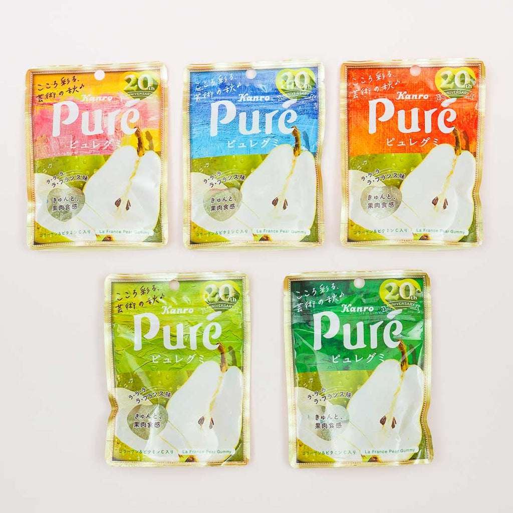 These unique gummies come in heart shapes and are all coated with sour powder! Enjoy the squishy treats bursting with delicious La France pears as you bite into them. The soft candies come in a handy resealable pouch so you can take them anywhere! You’ll receive a random pack out of five possible colors when you order.