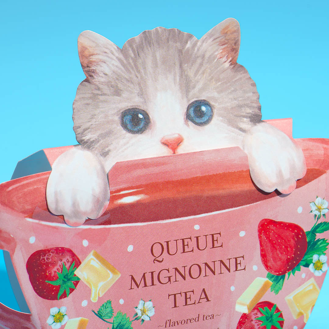 Enjoy the taste of strawberry and white chocolate as you take a sip of this comforting black tea. It comes in cute packaging featuring a cat peaking behind a teacup!