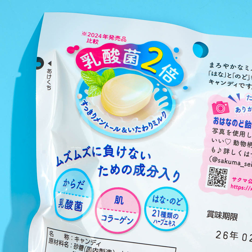 Soothe your throat with this creamy candy! It contains lactic acid bacteria, collagen, and 21 types of herbal extracts. The packaging features cute animals from a fan photo contest, with 50 different animal wrappers!