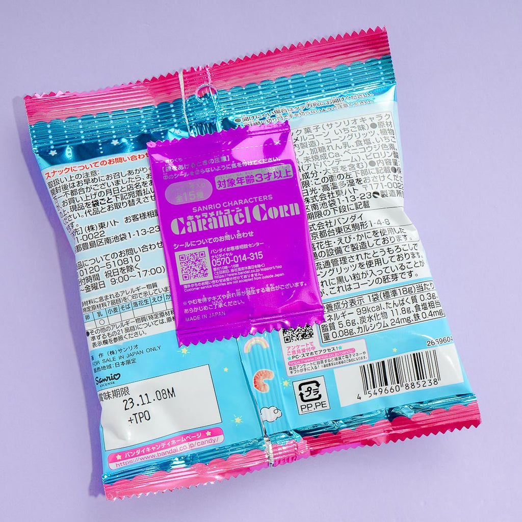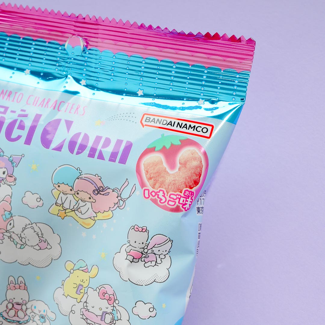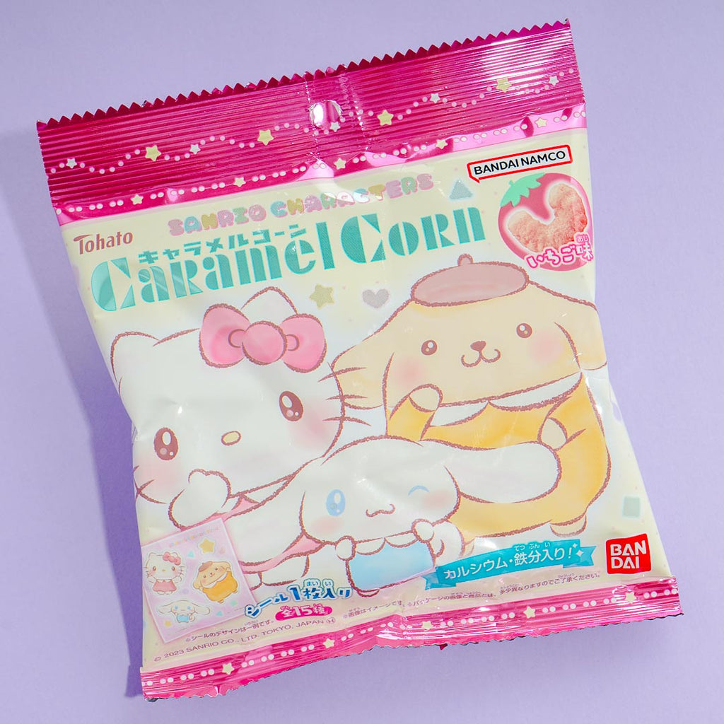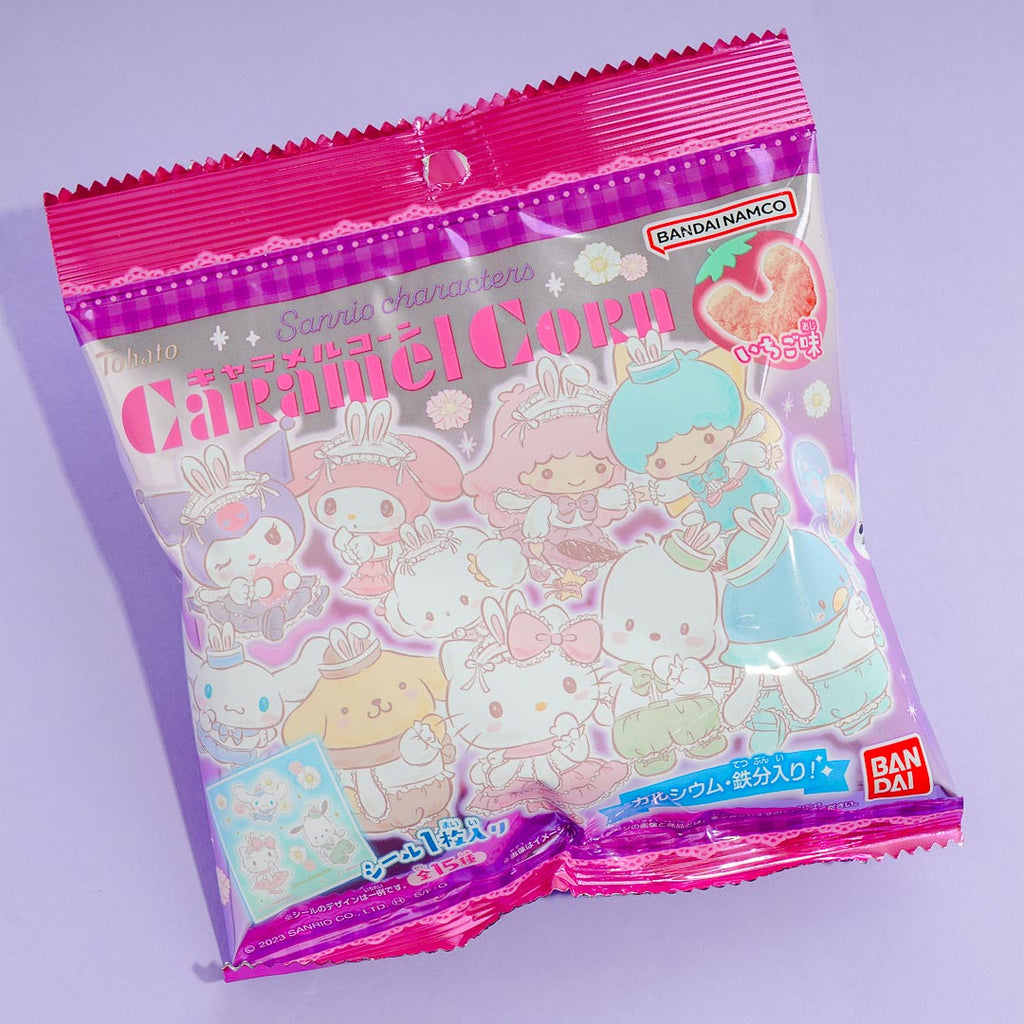 Enjoy the sweet taste of caramel with this pack of corn snacks! These puffy treats come in a Sanrio-themed bag with one surprise bonus sticker. Each puff is flavored with condensed milk and strawberry for a yummy sweet and sour taste.