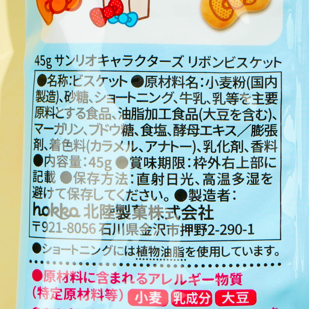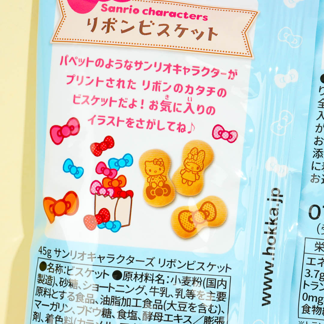 This pack of ribbon-shaped biscuits features prints of Sanrio Characters! The mildly sweet biscuits are made with Hokkaido milk and are a great snack for young children.