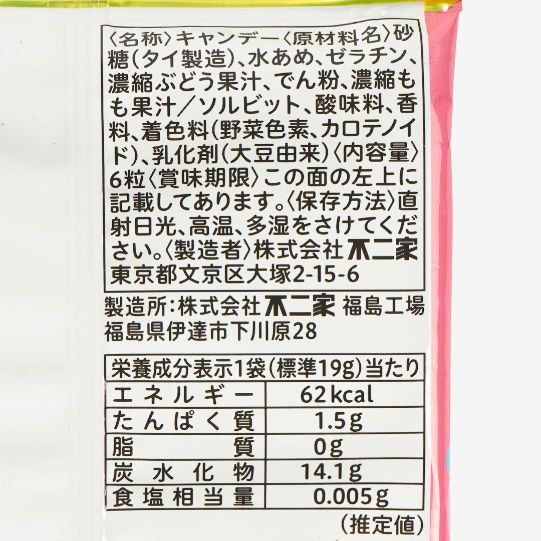 Enjoy nibbling on this pack of tasty peach and muscat-flavored gummy candies! It showcases prints of Sanrio characters hanging out with Fujiya's mascot, Peko-chan. These gummies also come with a cute Sanrio or Peko-chan figure.