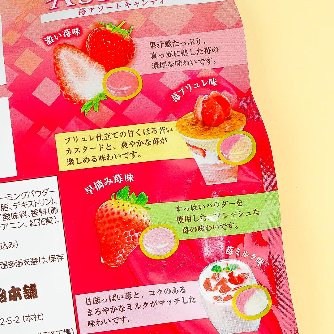 Enjoy four strawberry flavors in this pack of assorted yummy candies! The four flavors are Strong Strawberry, Strawberry Brulee, Early Picked Strawberry, and Strawberry Milk. These candies are made with Amaou strawberry juice!