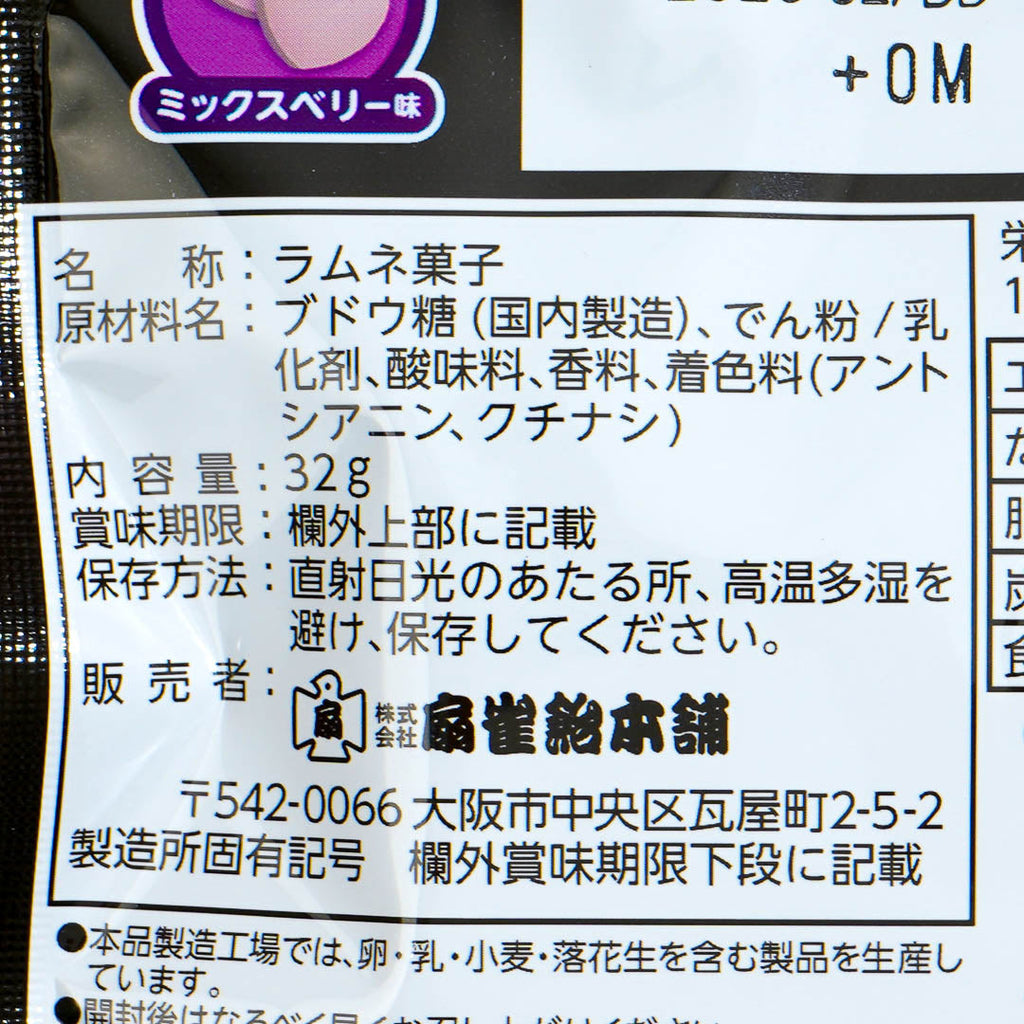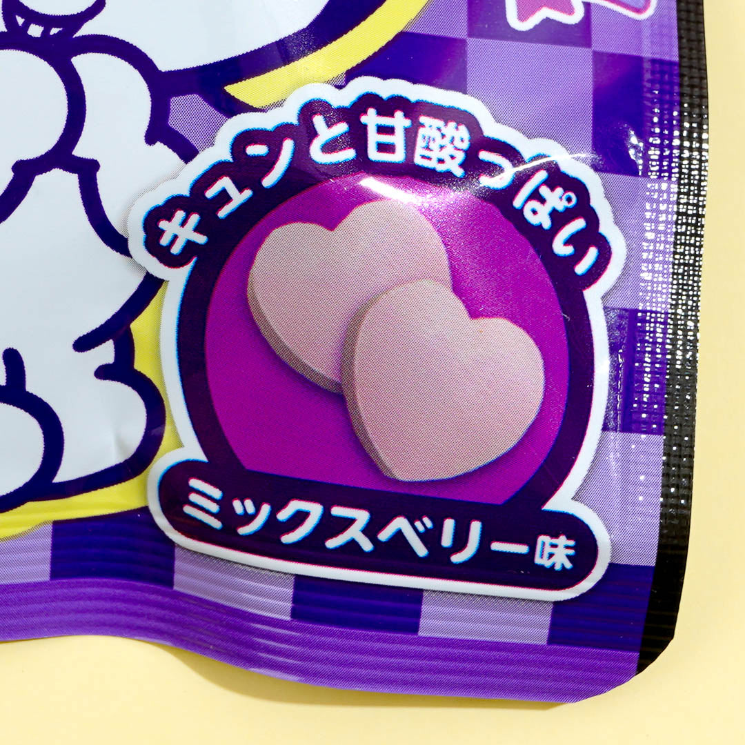 Enjoy this heart-shaped ramune candy with your friends! It features a fizzy, mixed berry flavor and comes in cute packaging showcasing Kuromi.