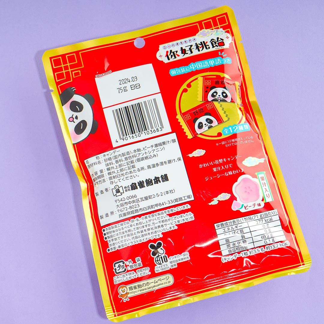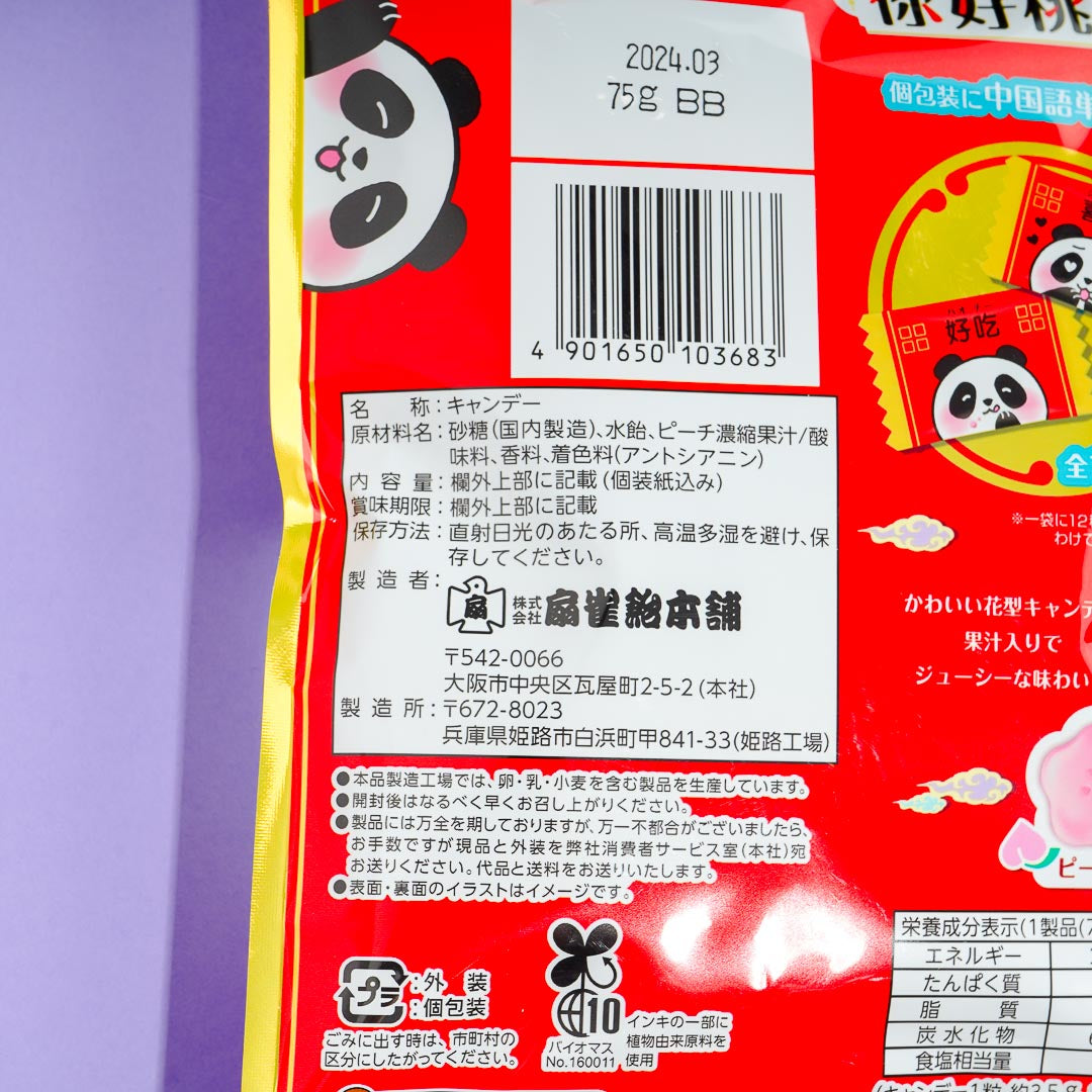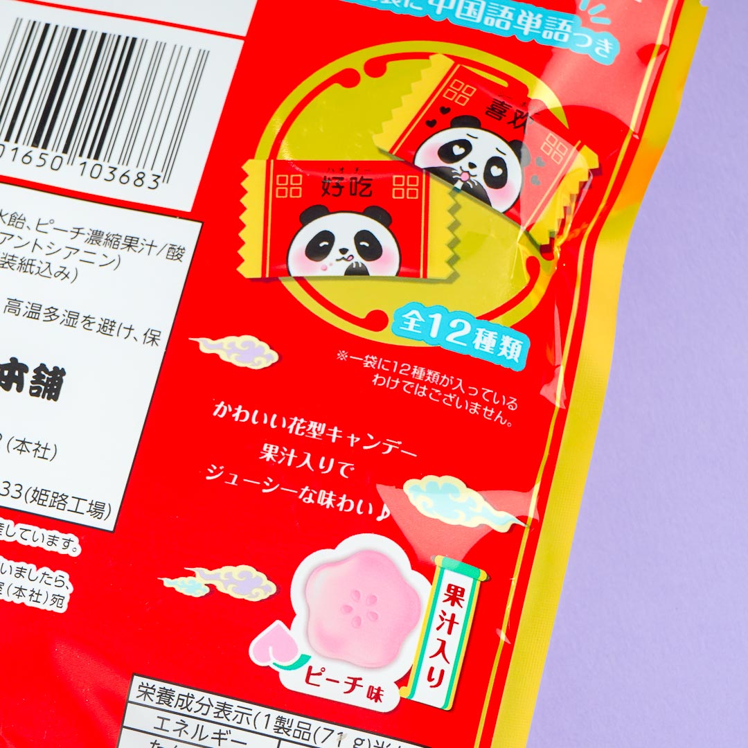 Enjoy this sweet, peach-flavored treat! It's a flower-shaped candy that comes in Chinese-themed packaging. Each individual wrap has a panda design with a Chinese word you can learn.