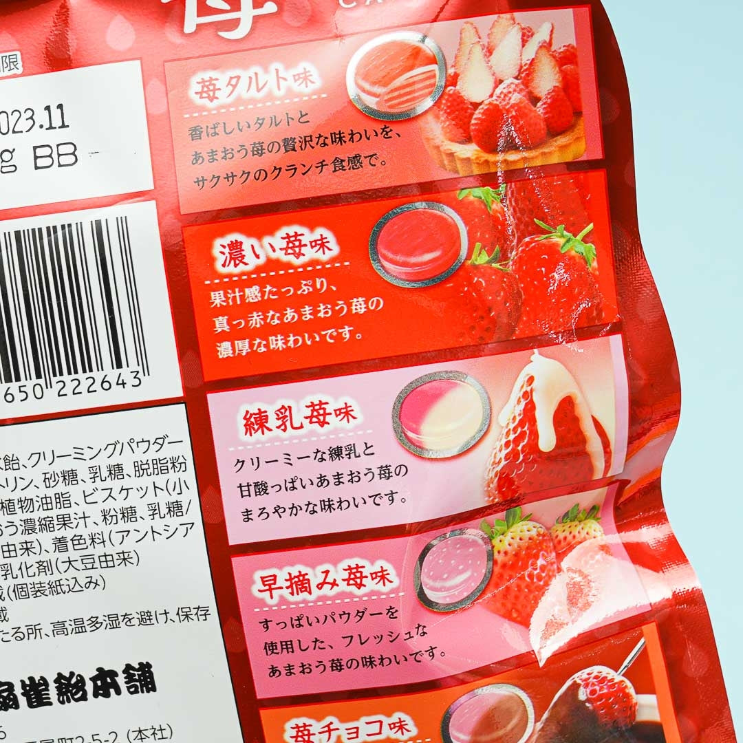 Savor the different kinds of strawberries as you try these candies! The pack has five assorted strawberry flavors: strawberry tart, dark strawberry, strawberry with condensed milk, white strawberry, and chocolate strawberry — that you and your pals can enjoy! These yummy treats come individually wrapped.