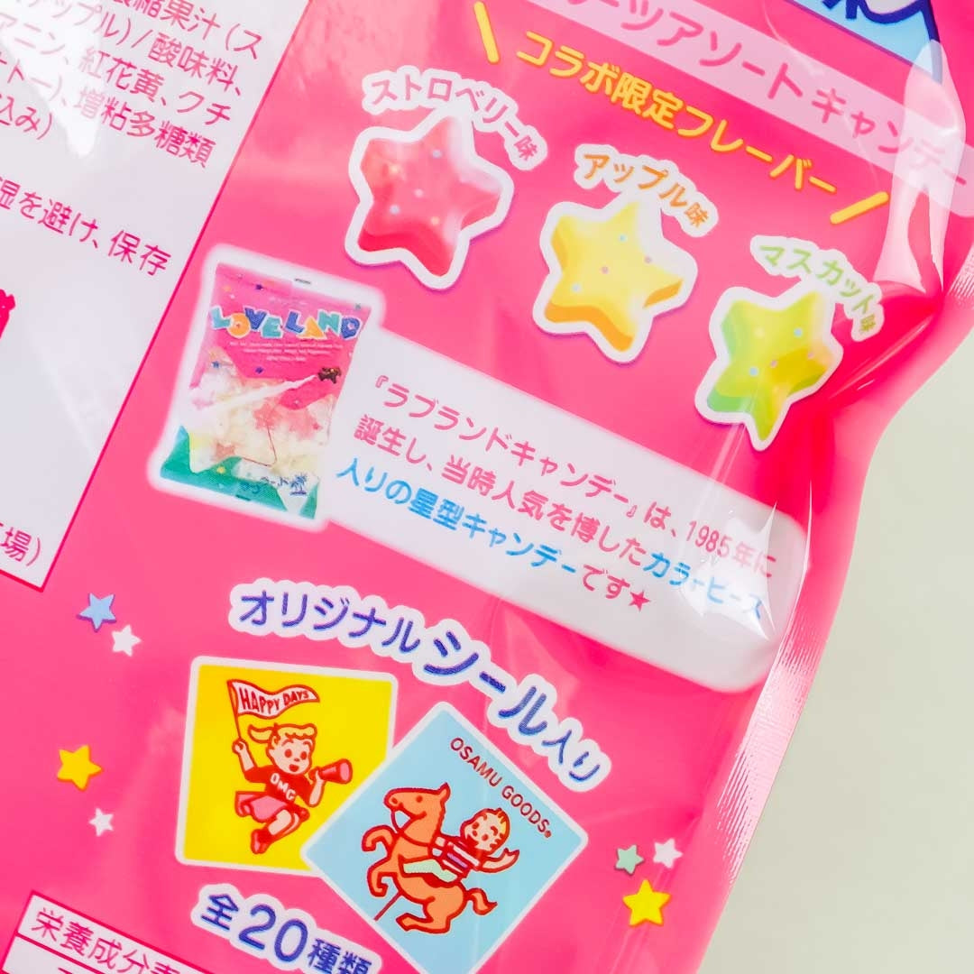 These star-shaped sweets have colored candy beads from OSAMU GOODS! Each piece is individually wrapped so you can take as many as you'd like when you head outside. Enjoy the apple, muscat, and strawberry flavors of this pack of hard candy. It comes with a cute sticker!