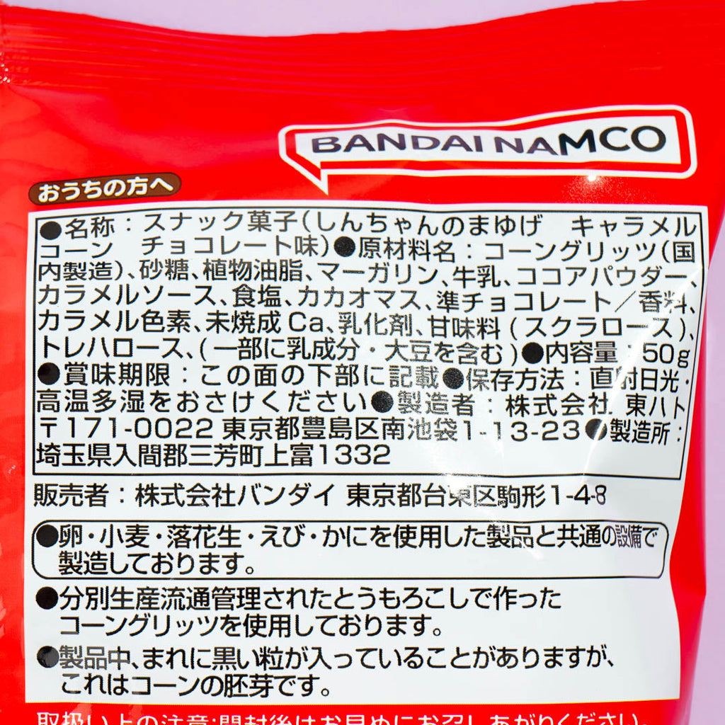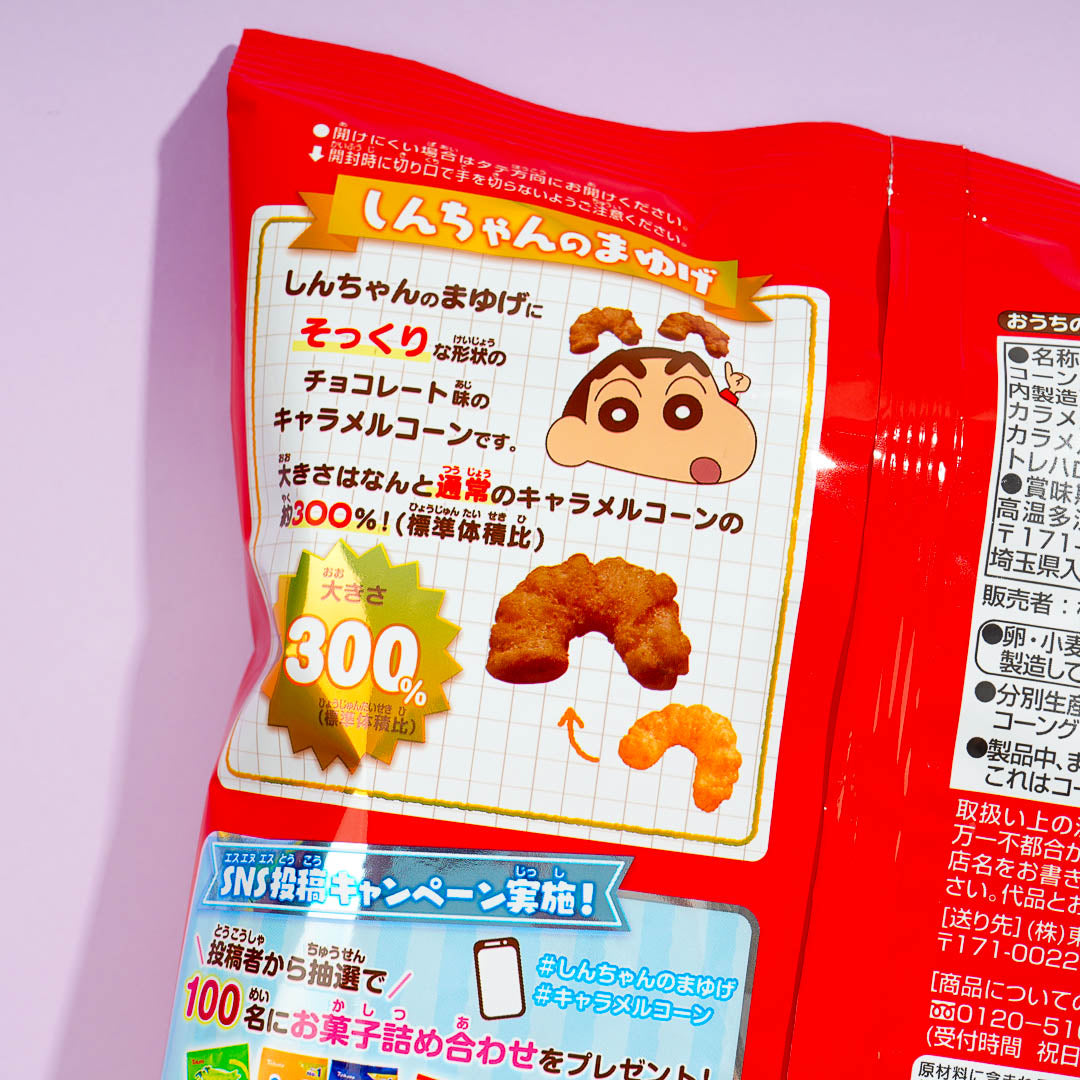 This yummy pack of Caramel Corn is inspired by Crayon Shin-Chan's thick eyebrows. Munch on these yummy chocolate-flavored corn puffs. Each piece is three times the size of regular Caramel Corn! You can have fun pretending to be Shin-Chan by placing the corn puffs on your eyebrows and taking photos.