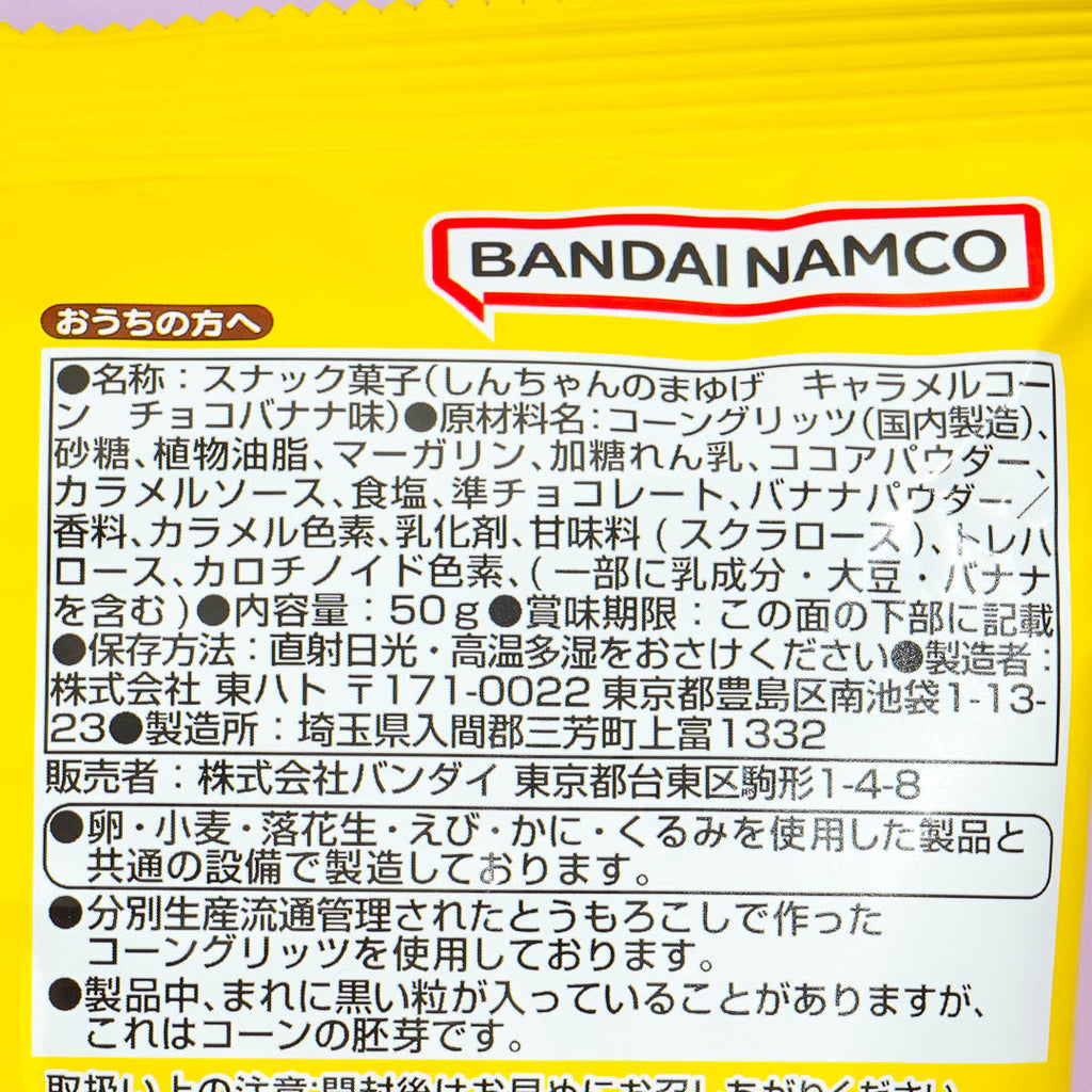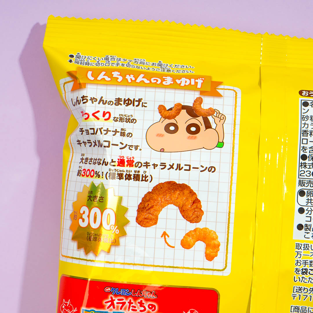 This soft, crunchy, melt-in-your-mouth snack is shaped just like Crayon Shin-chan's eyebrows! It has a delicious chocolate banana flavor and is about three times bigger than Tohato's regular Caramel Corn. Have fun playing with this snack before you eat it!