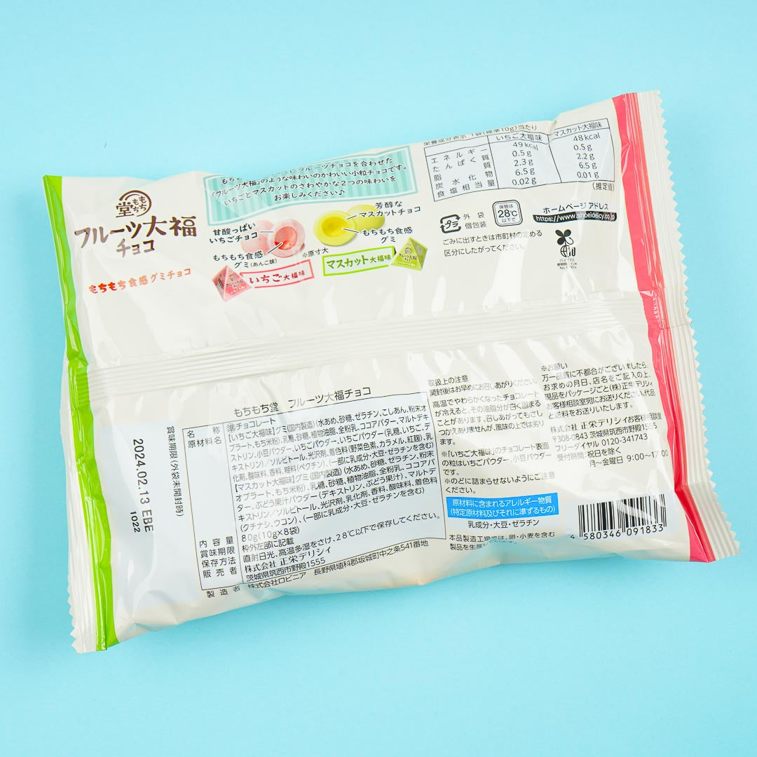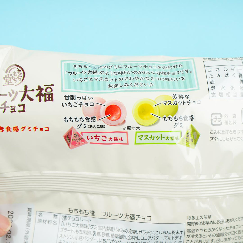 Enjoy the refreshing and sweet taste of "Fruit Daifuku" or mochi-covered fruits with this pack of gummies. It contains two chocolate flavors you can enjoy. First is "Strawberry Daifuku" which has the sourness of strawberries and the rich flavor of chocolate. The second is "Muscat Daifuku" which is a mixture of a variant of grape.