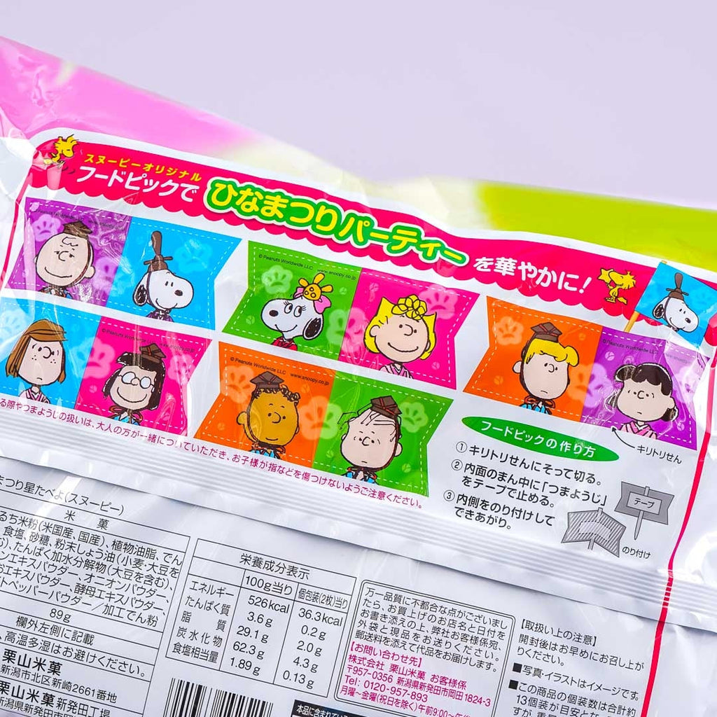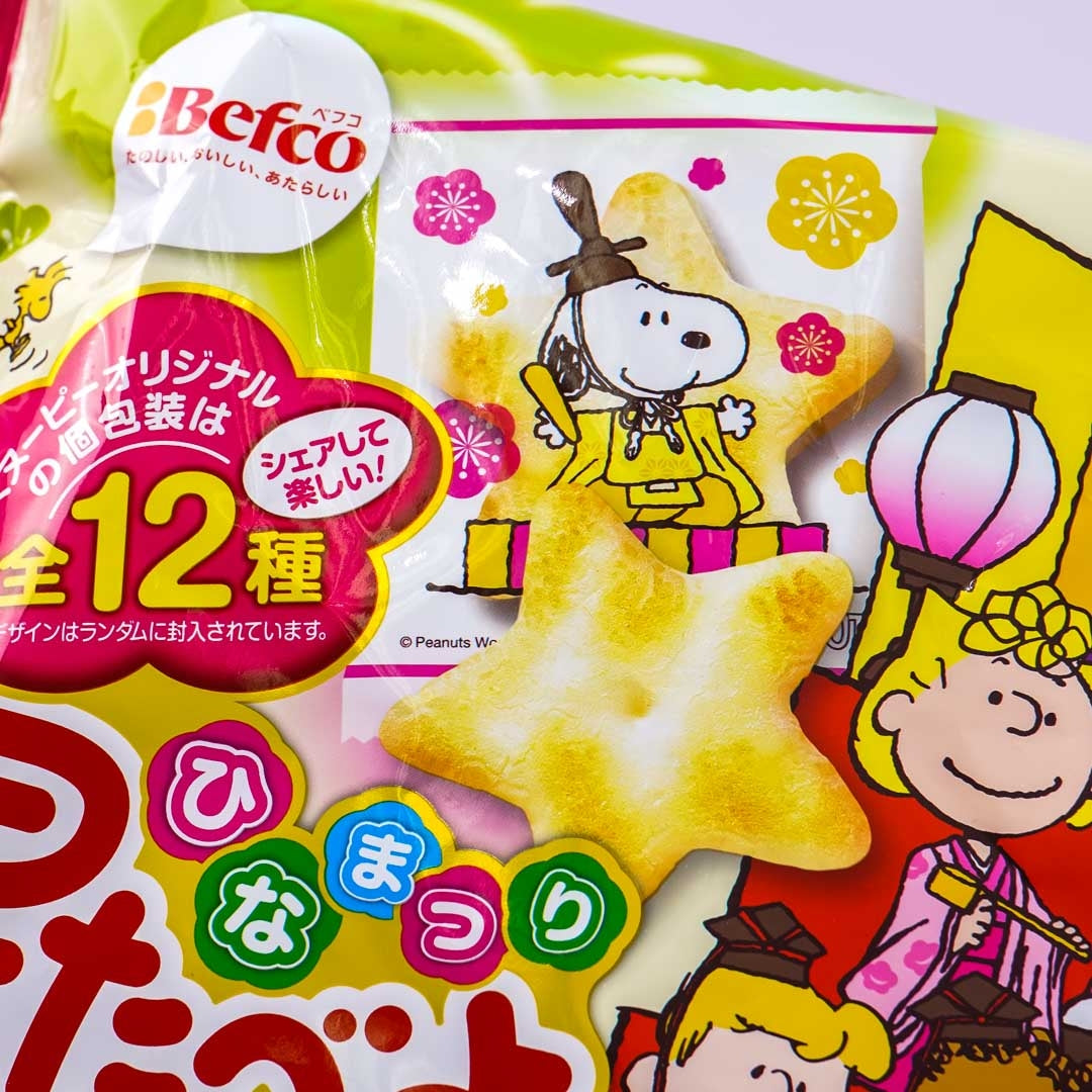 • A pack of star-shaped rice crackers illustrated with Snoopy characters dressed for Hinamatsuri