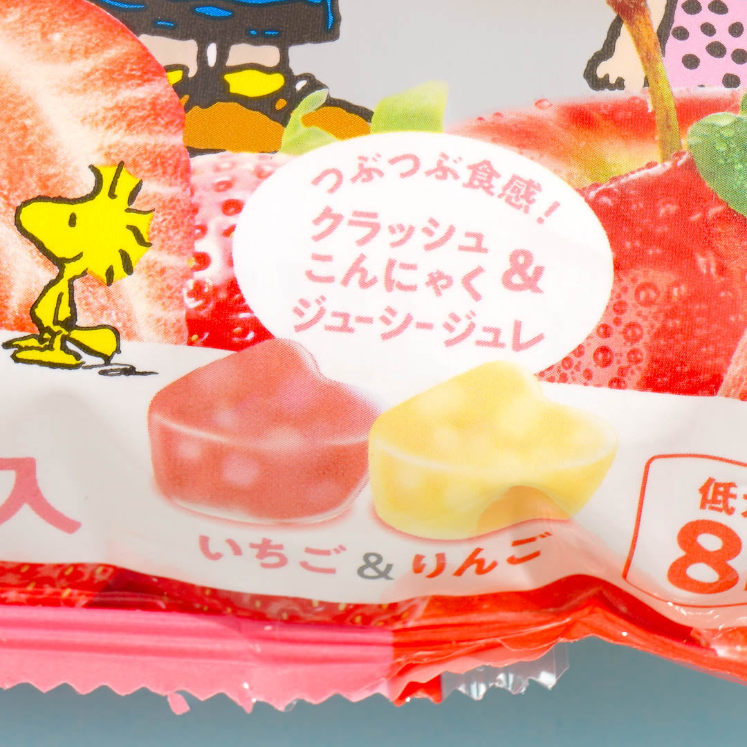 Treat yourself to this bag of jellies! It showcases prints of Snoopy and his friends from Peanuts. There are two different jelly flavors for you to enjoy - strawberry and apple.