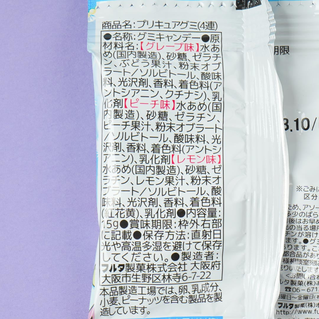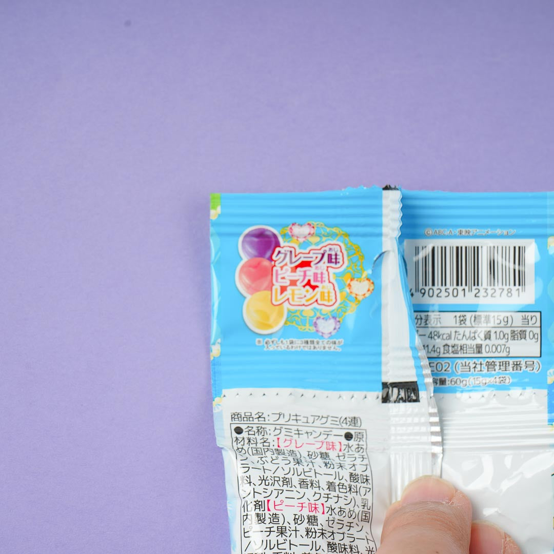 Enjoy the fruity and refreshing tastes of grapes, peaches, and lemons with these packs of gummies. The packaging features a kawaii illustration of characters from Soaring Sky! Pretty Cure. It's perfect for rewatching your favorite anime series.