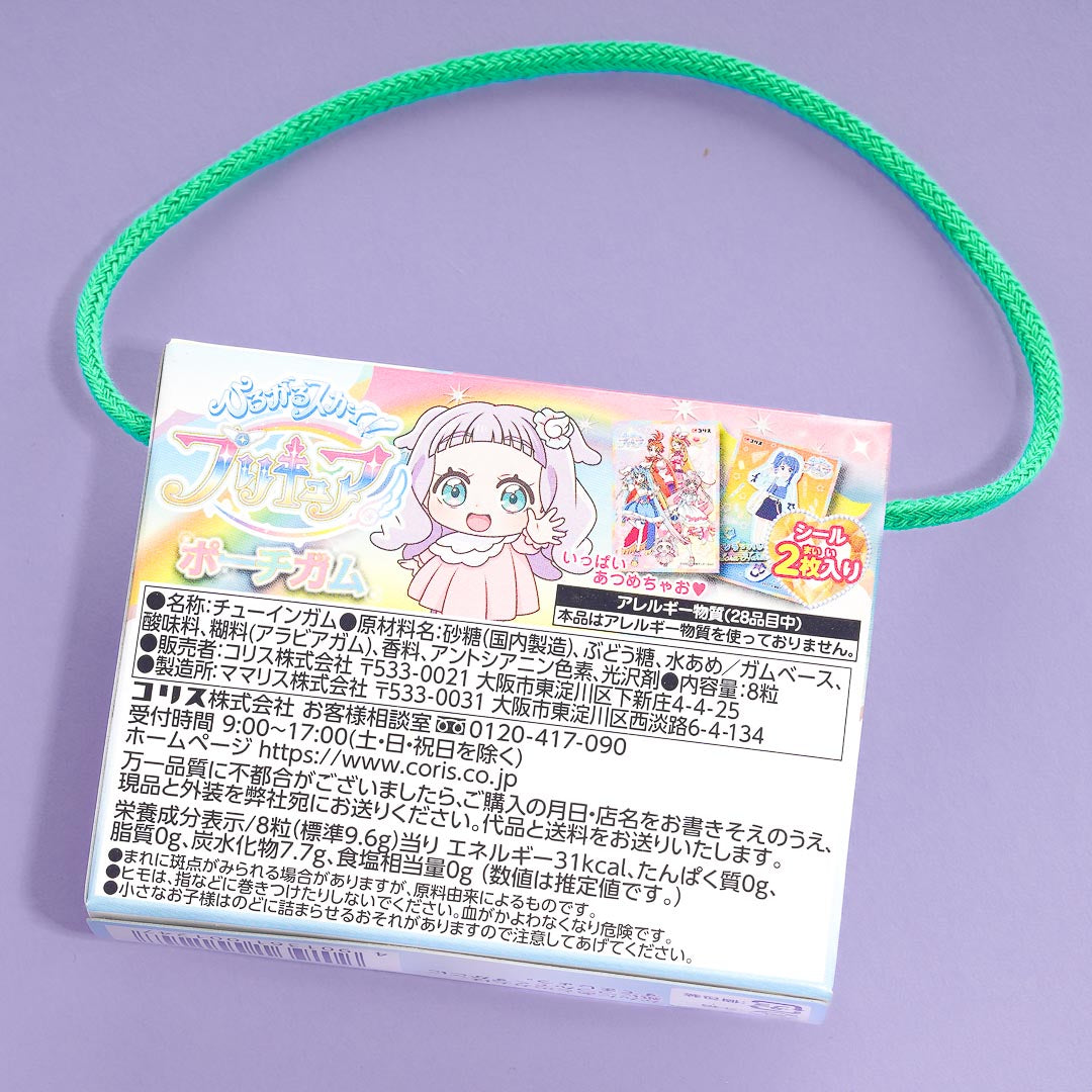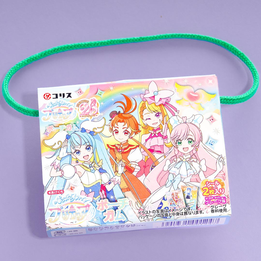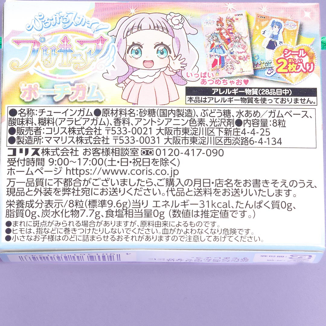 This box of grape-flavored marble gum is decorated with prints of Soaring Sky! Pretty Cure characters. Share the gum with your friends. You can take it with you when you head out thanks to its handy box strap. It comes with two Pretty Cure stickers!