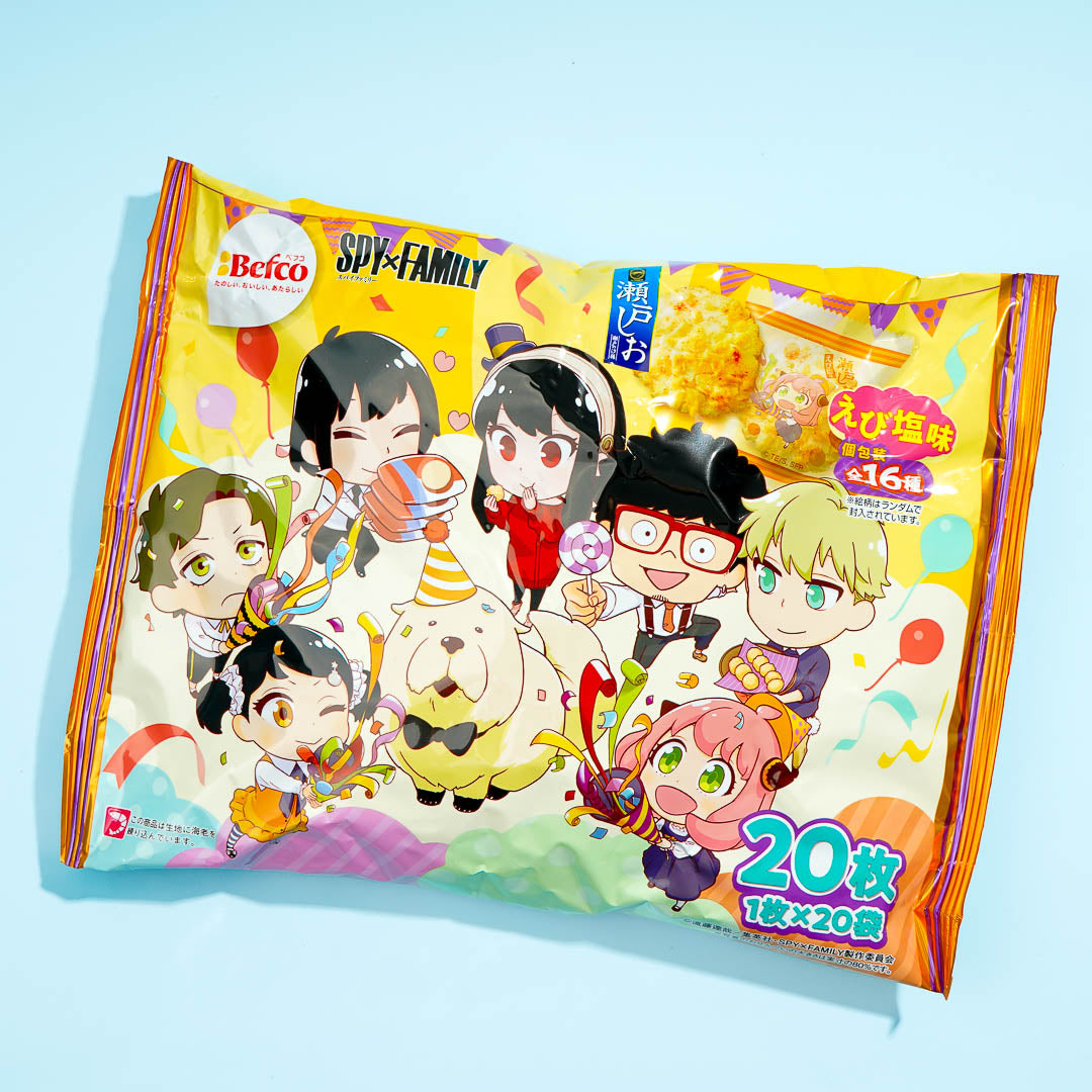 Enjoy munching on this crispy and light rice cracker snack! It's made from rice flour with small shrimp pieces. This large pack features kawaii illustrations of the anime SPY x FAMILY.