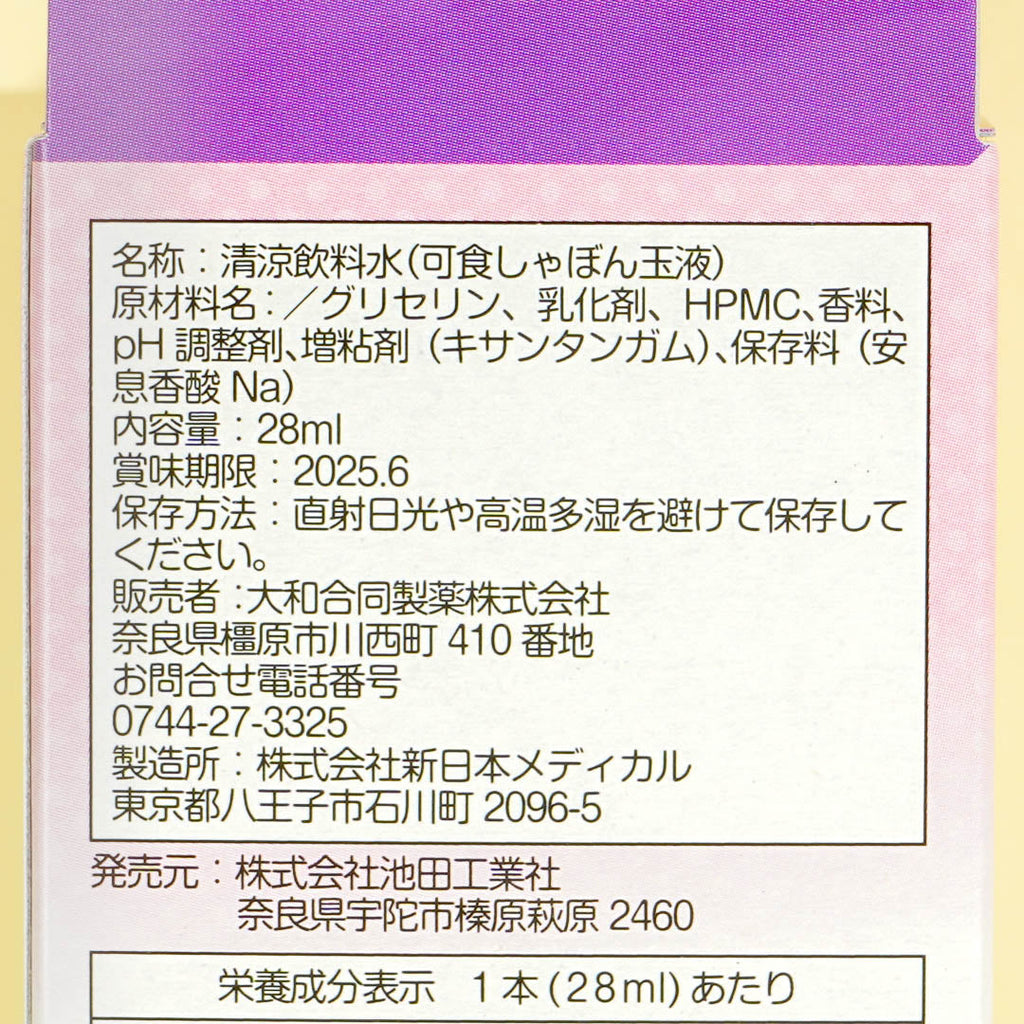 I have loved everything I have received from Japan candy store but this was an absolute disappointment I wish I could get a refund on it it should not be labeled as edible as it does not taste anything like grape or candy taste exactly like dish soap at this price this is unacceptable this is about a $3 bottle of bubbles for $8 you're better off if you just want something that is scented and bubbles go with jelly Bean scented bubbles the saddest part is I also bought it in Ramune blue flavor this was also the same letdown $16 down the drain well minus $6 for bubbles $10 dollars down the drain I'm glad I also didn't buy it in strawberry flavor thank God I hope Japan candy store takes this product down as it is not edible and does not match the description of the product! And I don't think any person would be satisfied as it doesn't even smell like grape or ramune soda shame shame!
