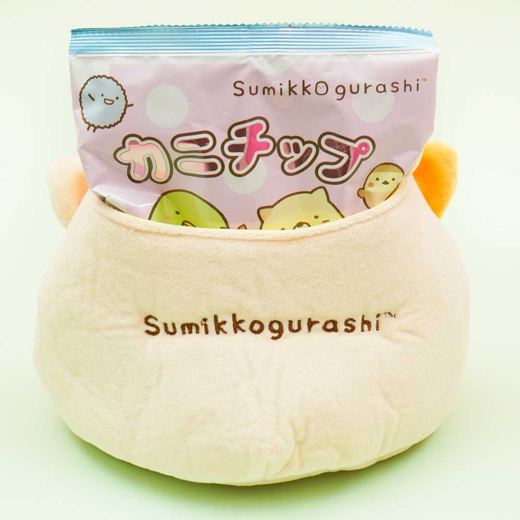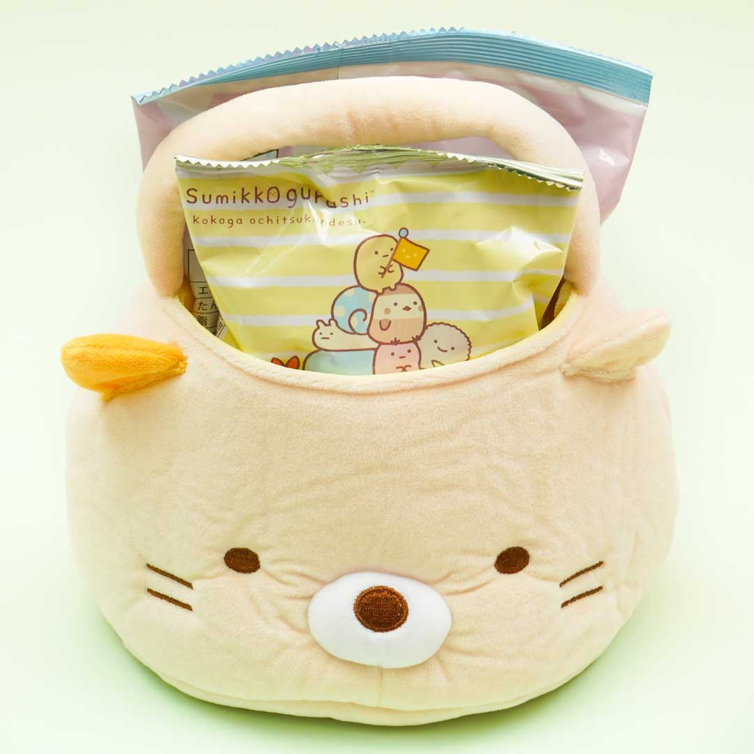 A cute Sumikko Gurashi bucket bag with two packs of snacks