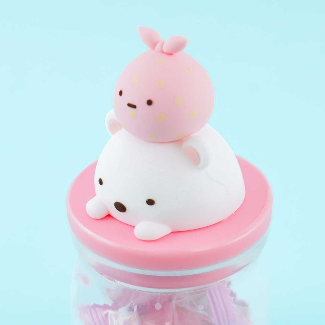 Share this bottle of individually wrapped strawberry-flavored candy with your friends. The lid of this bottle has a Shirokuma and Furoshiki decor from the Sumikko Gurashi! You can reuse this bottle to store your trinkets and knick-knacks.