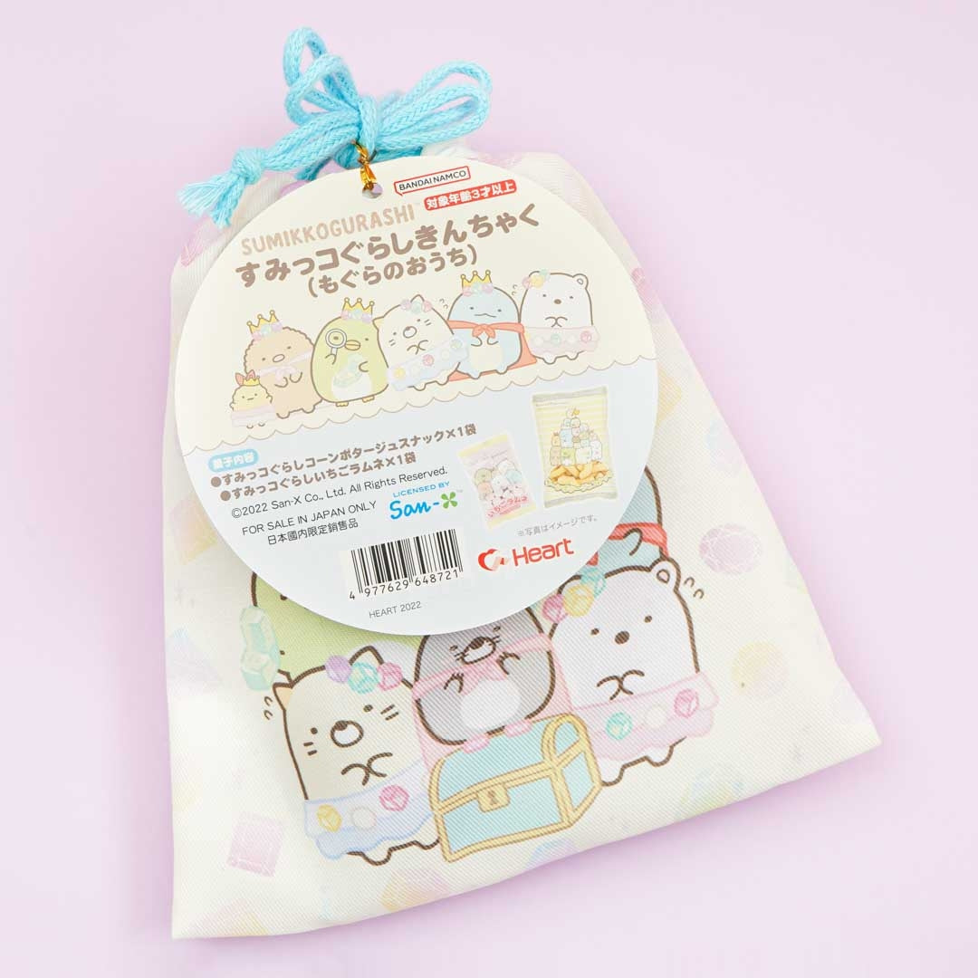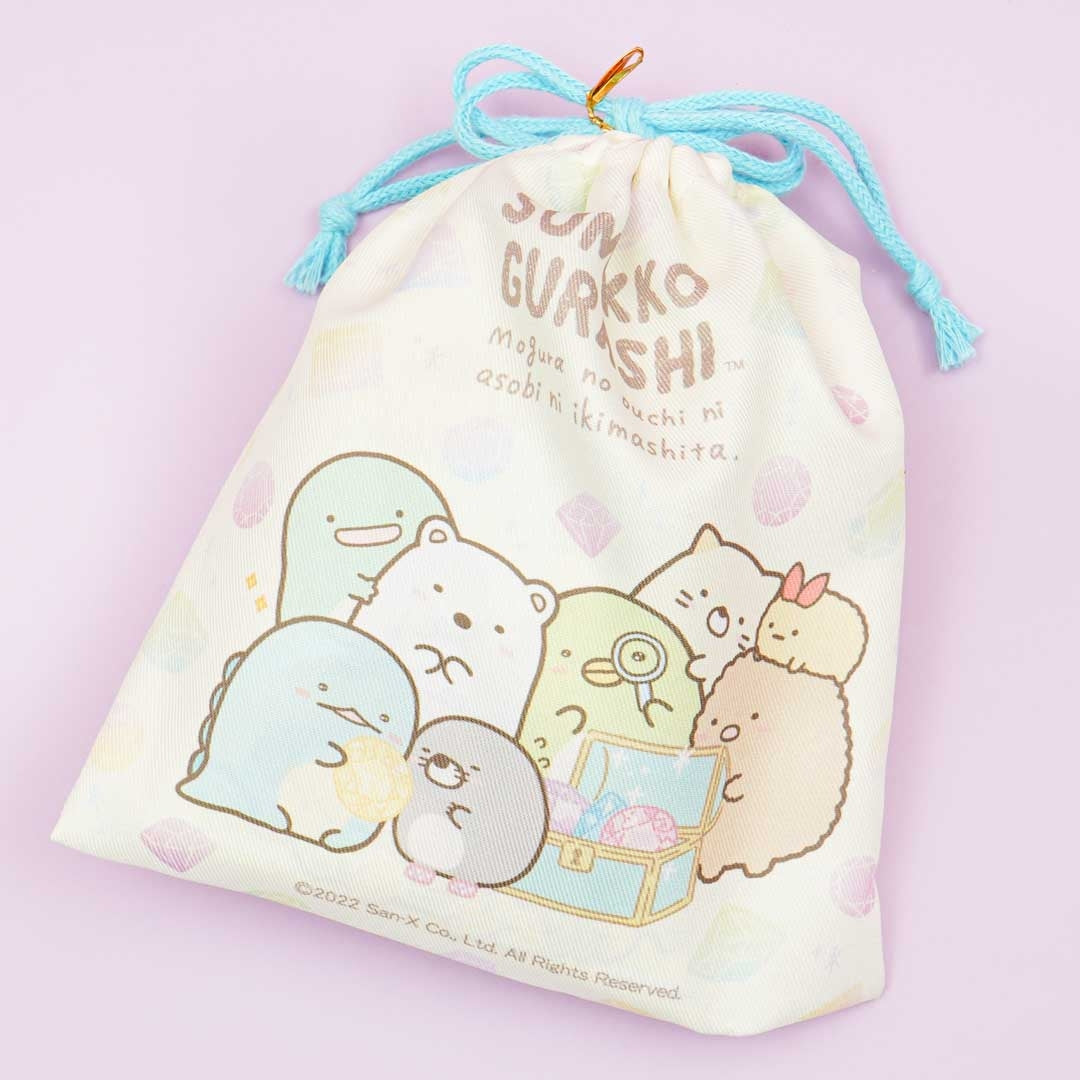 • A kawaii drawstring snack bag featuring the Sumikko Gurashi characters and gems