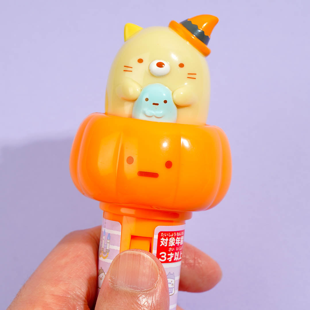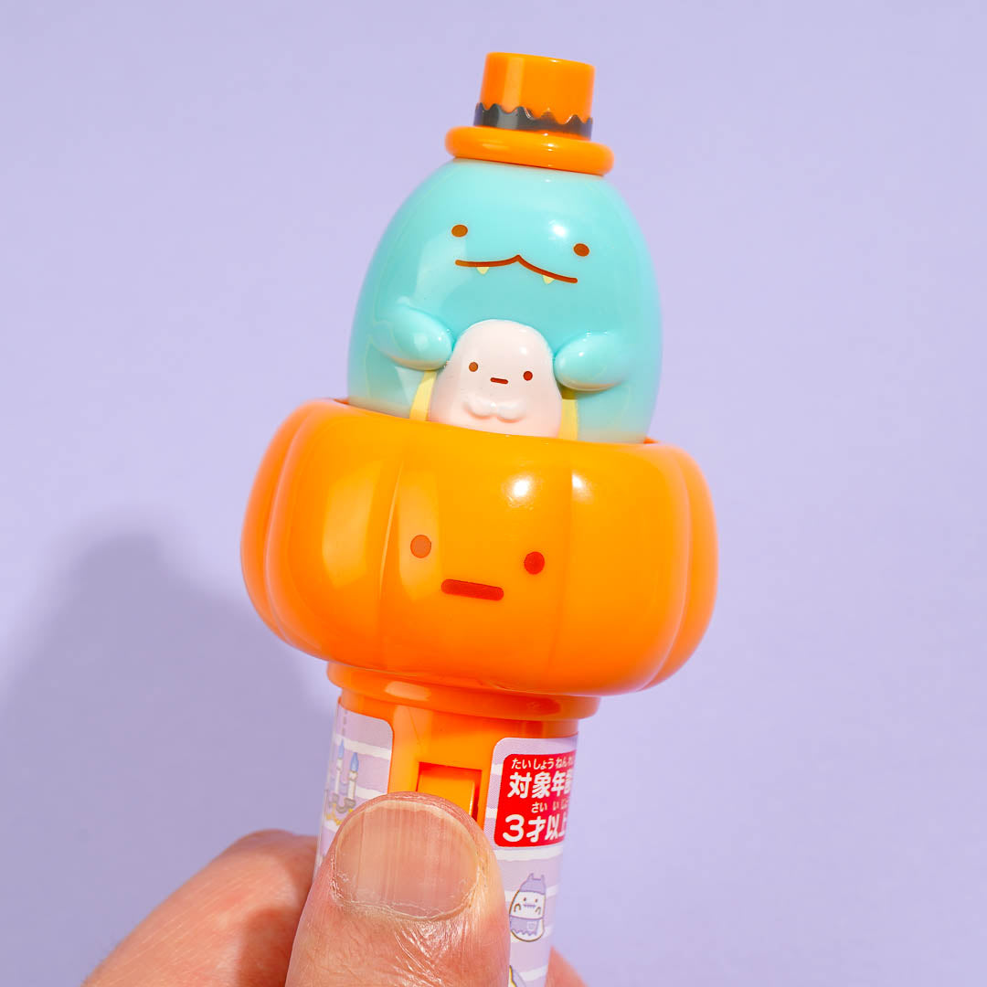 A stick-shaped toy with a Sumikko Gurashi character inside a pumpkin
