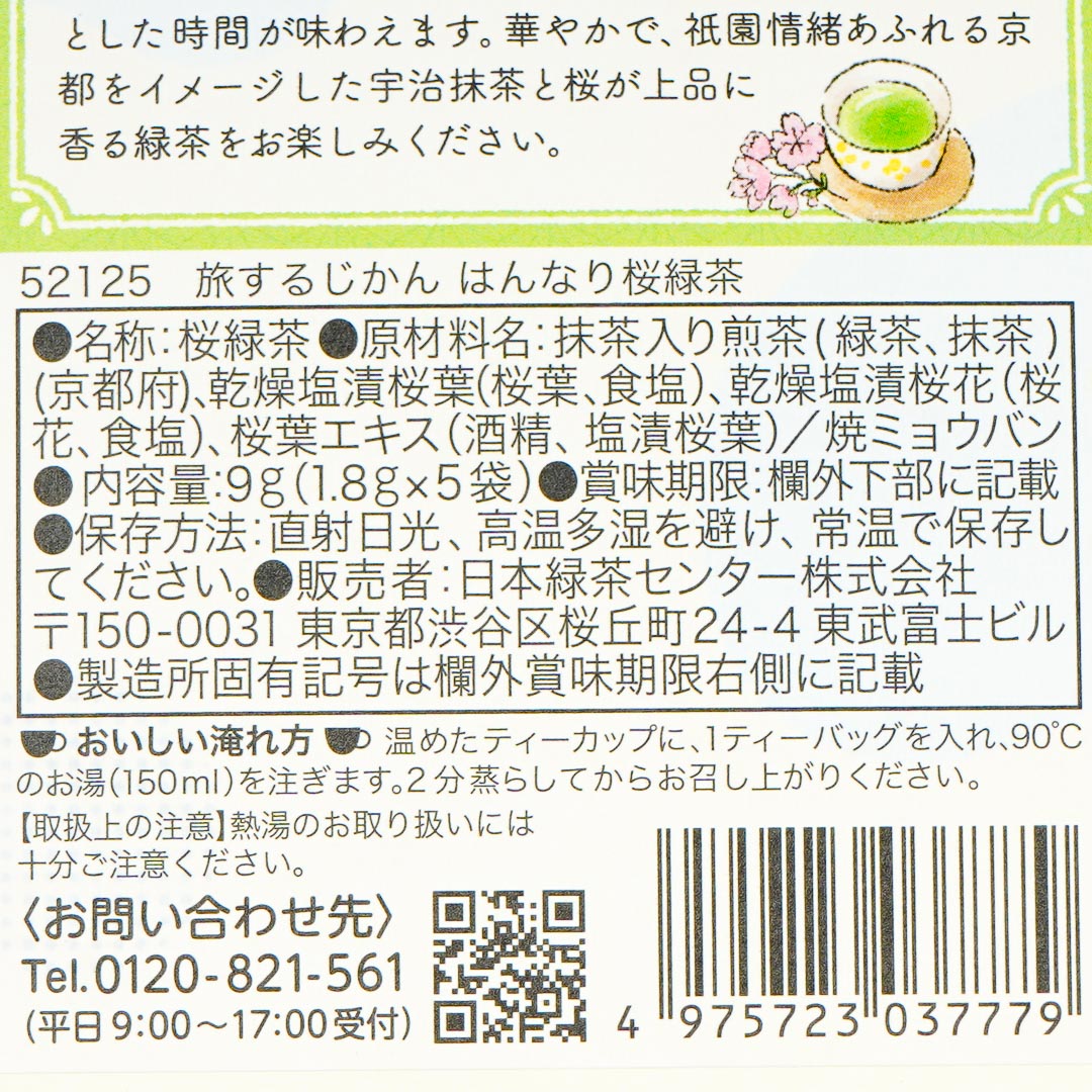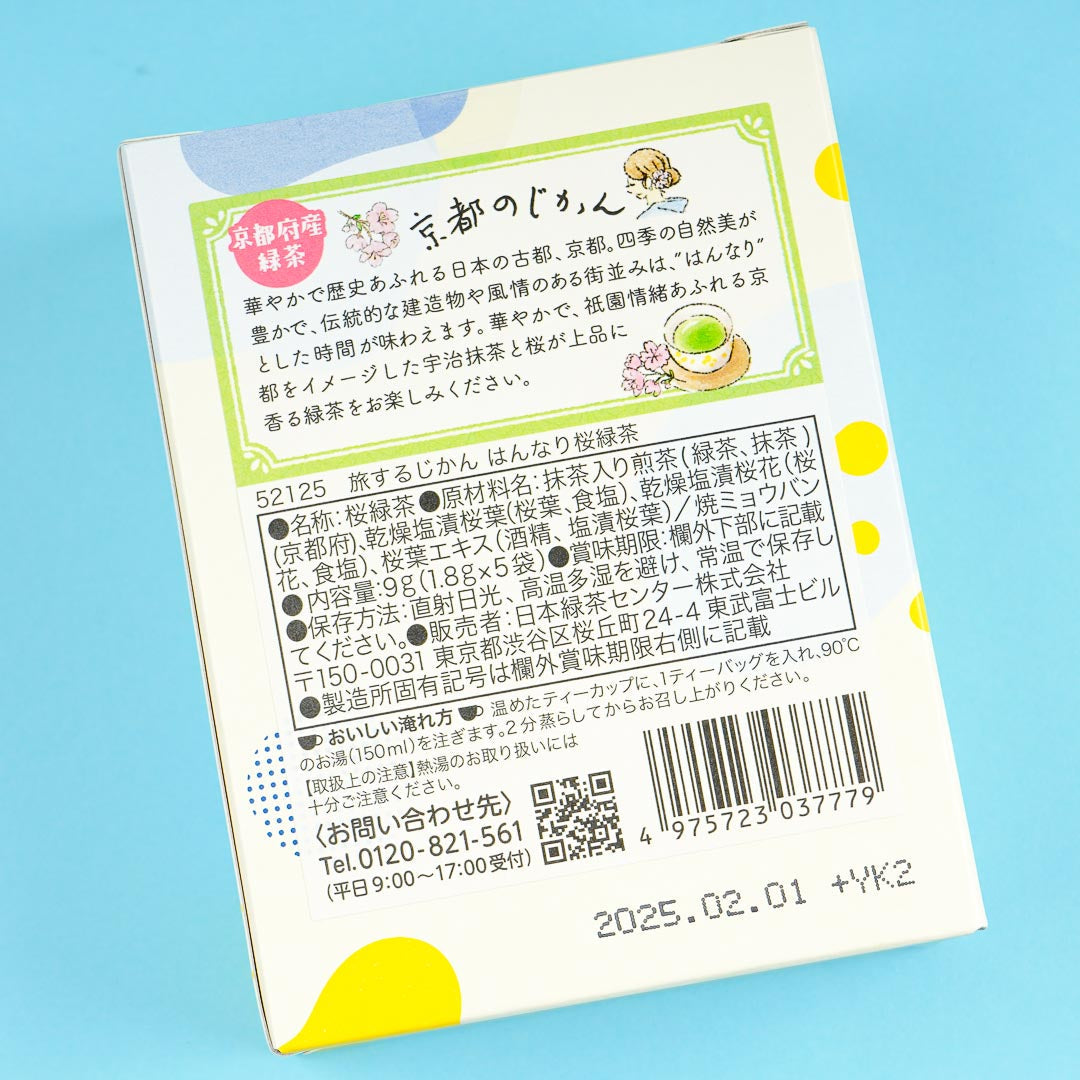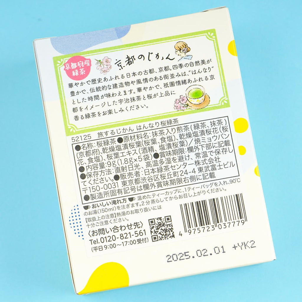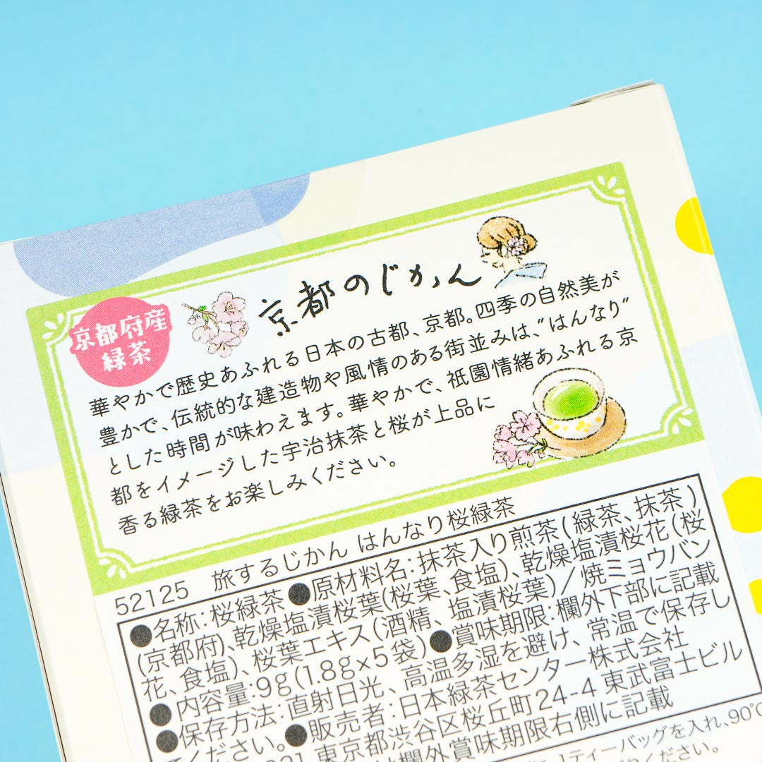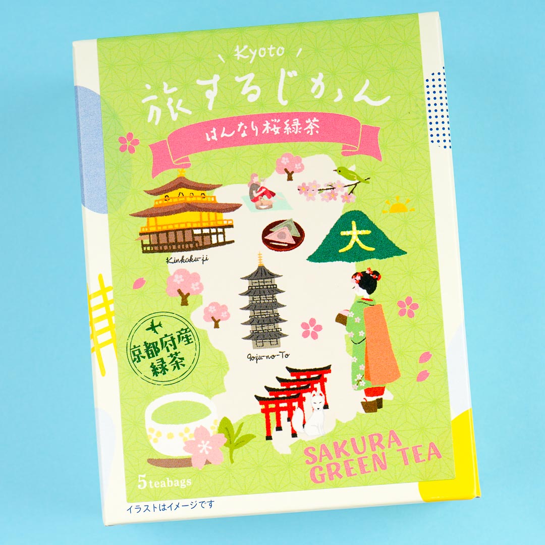 Enjoy a Sakura-themed afternoon tea with friends! This green tea has an elegant scent of cherry blossoms. It comes from the Travel Time series and features the beautiful and relaxing Kyoto Prefecture.