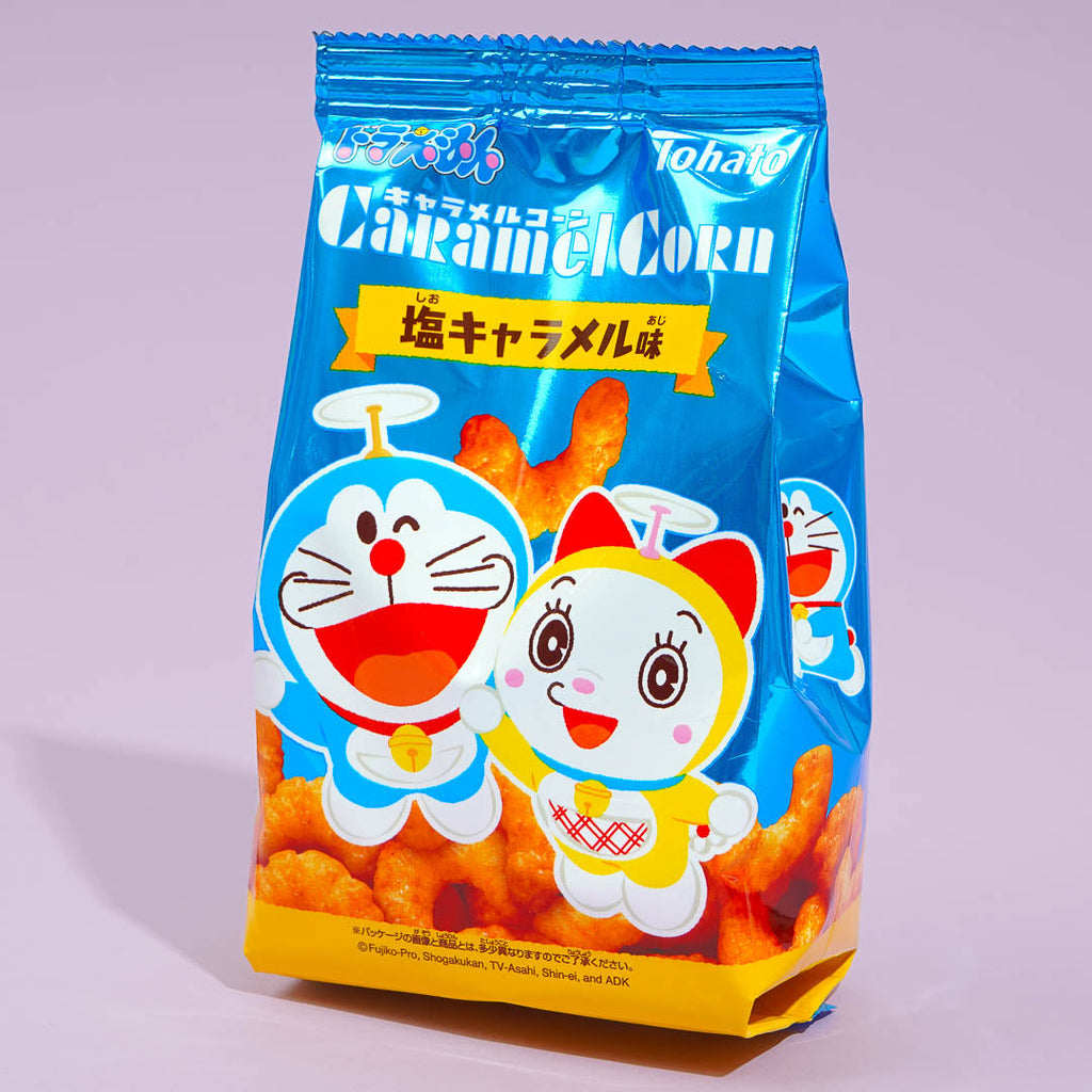 Share this pack of caramel-flavored corn puff snacks with your besties!  It features a print of Doraemon characters. These caramel corn puffs are slightly salted to help bring out the taste of caramel.