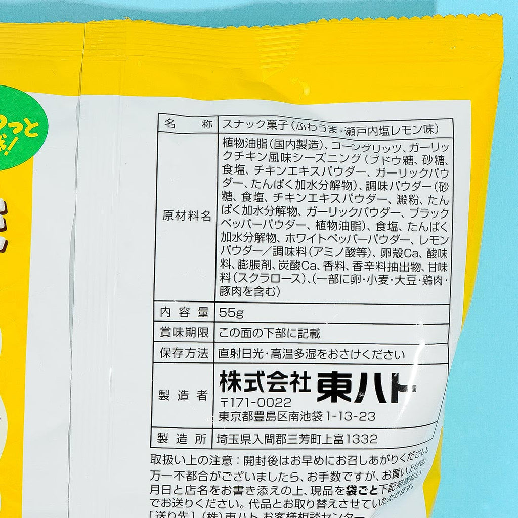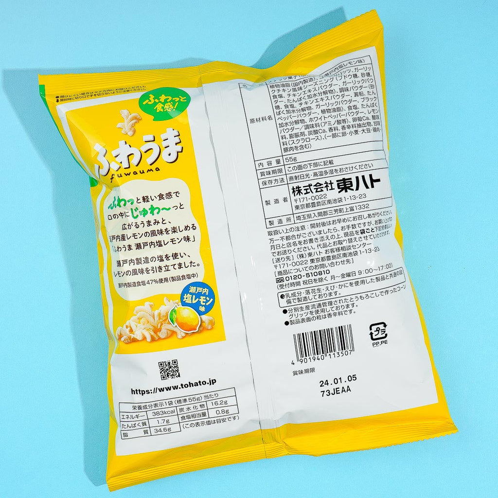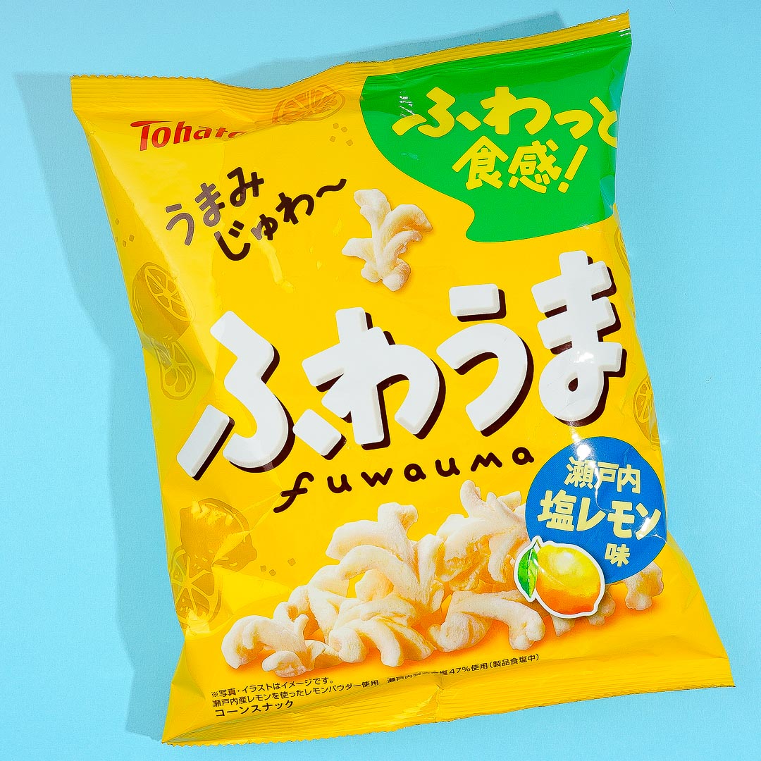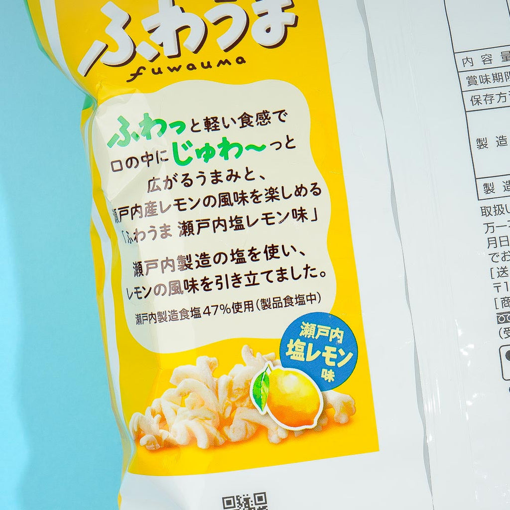 Fuwauma is a corn snack with a soft and light texture that melts in your mouth. It features an umami flavor mixed with the refreshing taste of Setouchi lemon. Enjoy this snack while watching your favorite show!