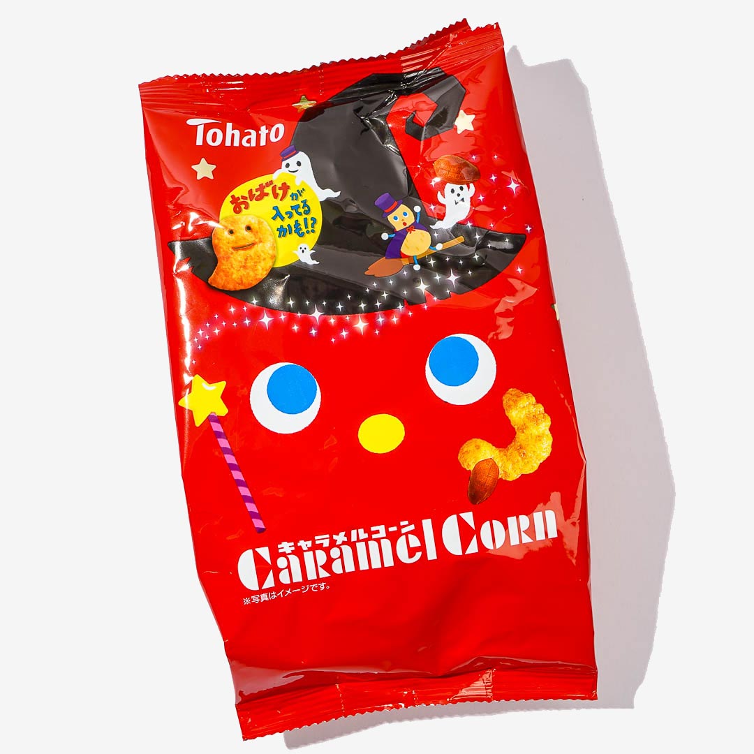 A bag of Halloween edition caramel corn puff snack