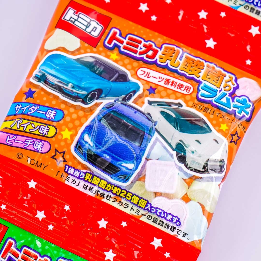 Ramune is a delicious Japanese carbonated soft drink! Try out ramune when you eat this candy pack set featuring prints of different vehicles! It has cider, pineapple, and peach flavors for you to enjoy.