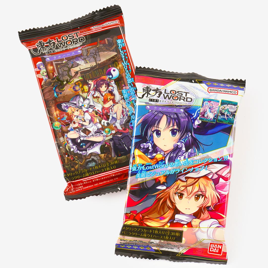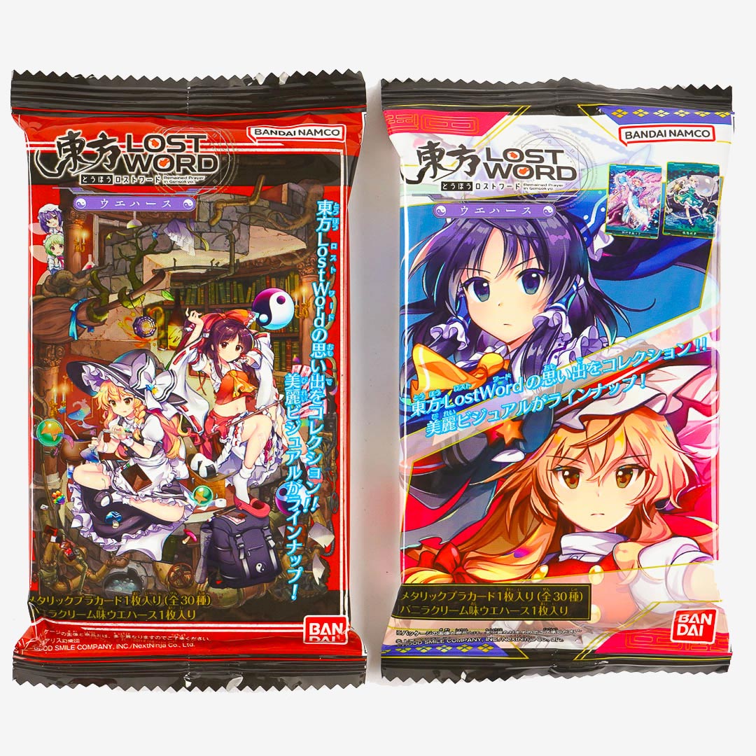 This vanilla cream wafer pack features prints of characters from the game Touhou Lostword! Add it to your snack haul. Inside the pack you'll find a collectible Touhou Lostword card.