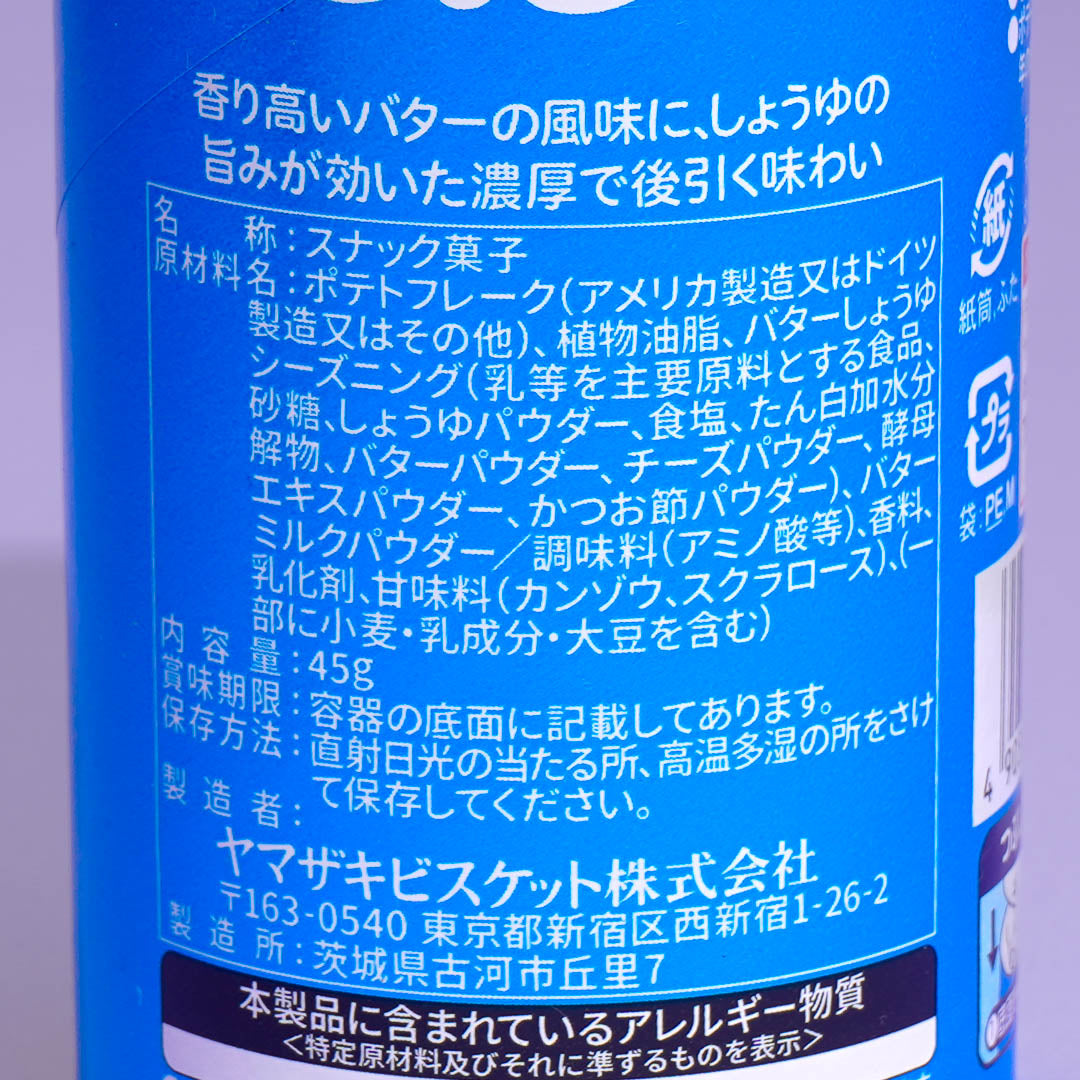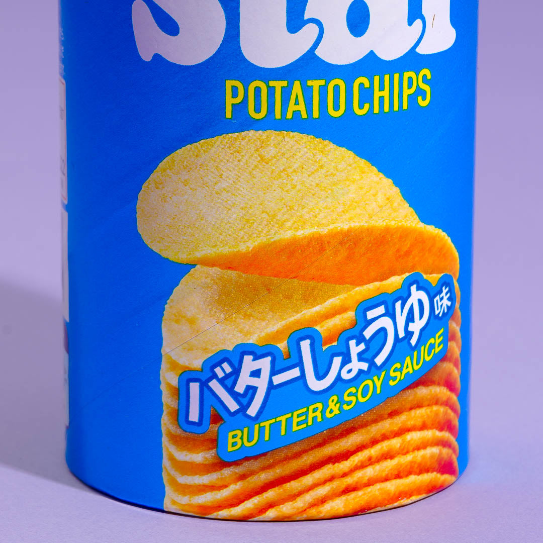 These butter & soy sauce flavored Chip Star potato chips from YBC come in a handy cylinder-shaped tube. With a resealable lid, they are easy to take with you without smashing the individual chips. Chip Star chips are available in various flavors throughout the year. Tasty!