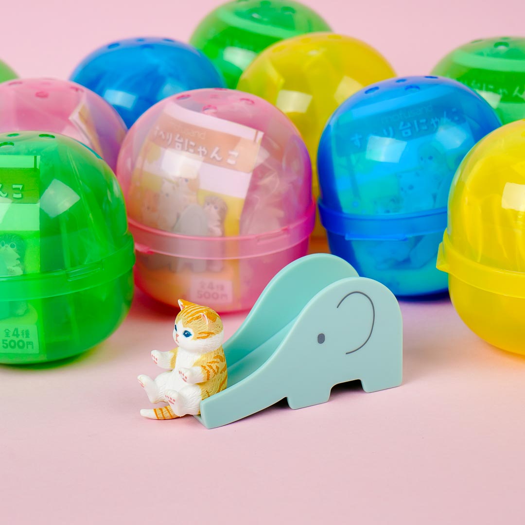 This cute toy comes with a kawaii Mofusand cat and a slide. It's placed in a gachapon capsule so what you get is always a surprise. Collect them all and have a cute cat playground!