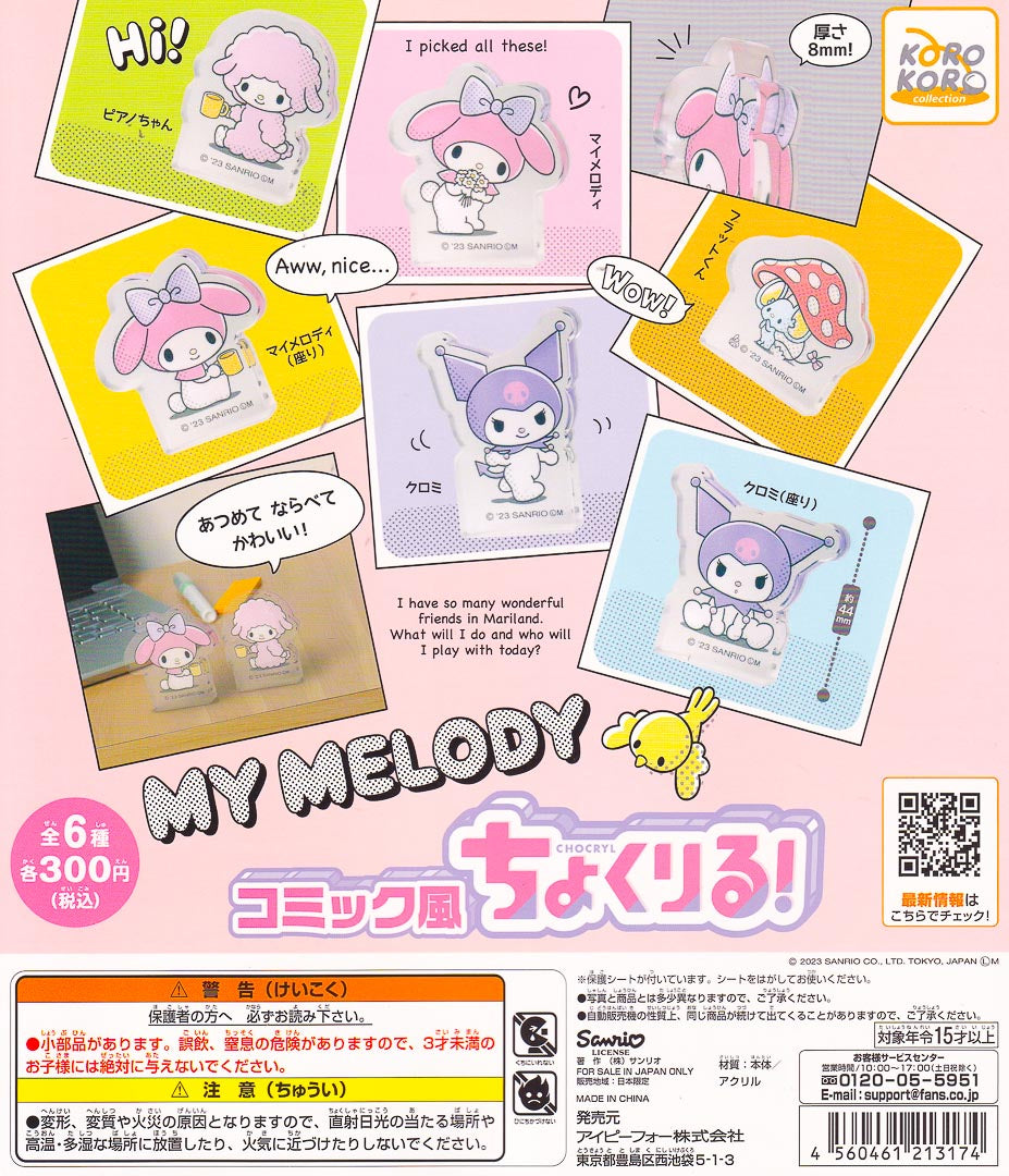 Enjoy collecting all the cuties from the “My Melody & Friends Comic Style Chokuriru! Gachapon” series! It features a die-cut collectible with a comic-style illustration of either My Melody or her friends.
