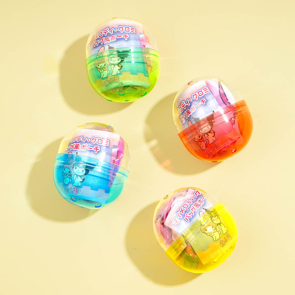 Use this super kawaii pouch to store your small essentials! It features a bag-style design with a cute print of My Melody and Kuromi. This pouch comes in a gachapon capsule, with 4 designs to collect!