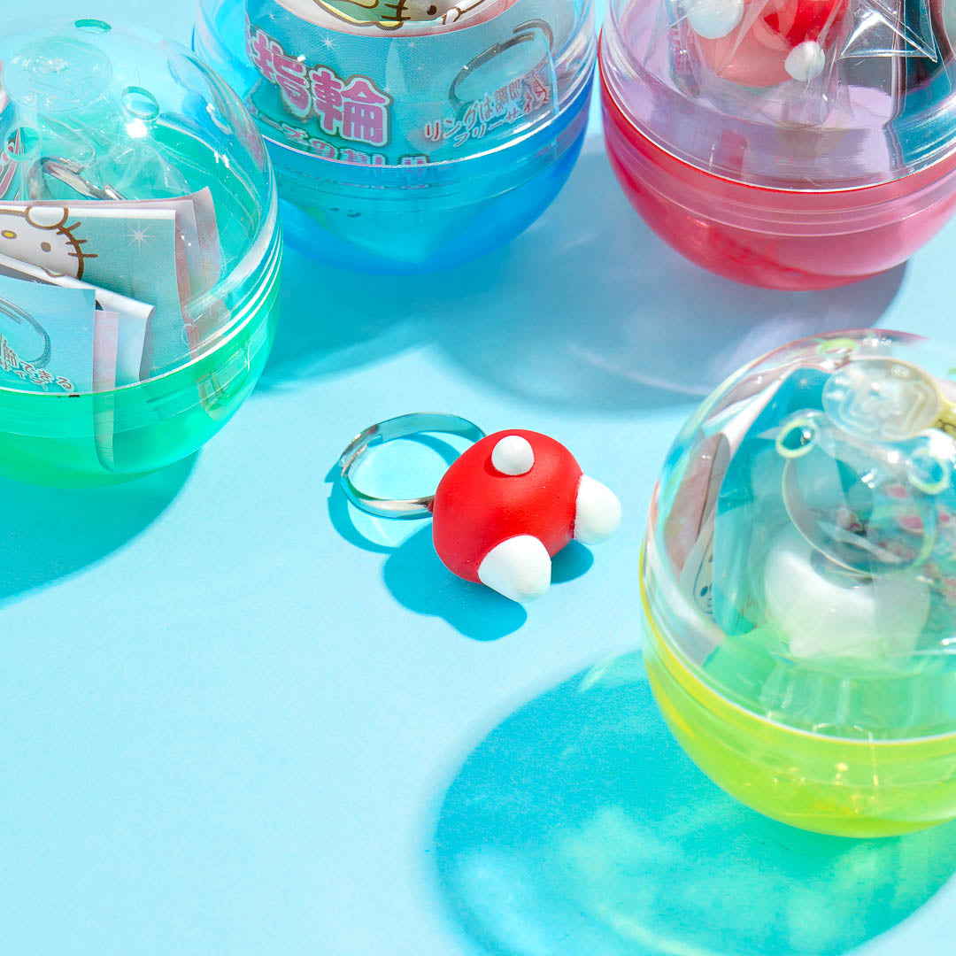 Gachapon vending machines are widely popular and can be seen everywhere in Japan. They dispense kawaii Japanese collectible items placed inside a Gachapon capsule. The fun part is you don’t know exactly what you’re going to get! Experience the thrill of a Japanese toy vending machine with this toy ring! You’ll receive a random one out of four designs, just like in real Gachapon games!